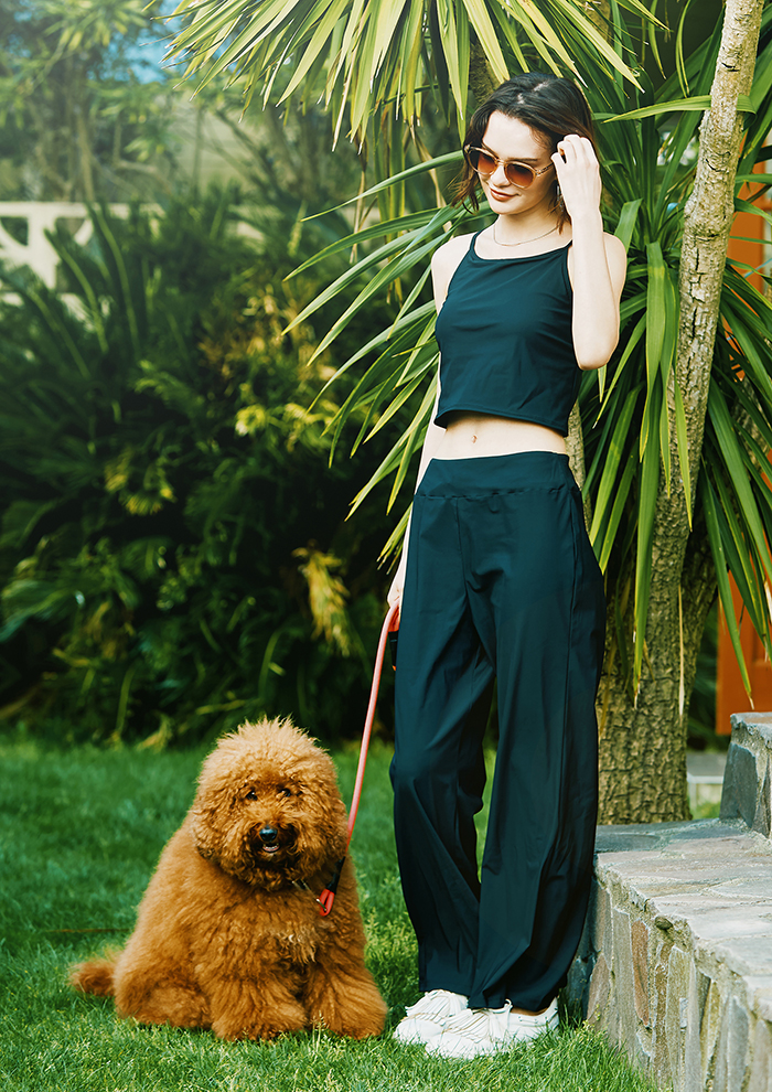 「こちらは、モード感のあるすっきりとしたバランスにこだわったセットアップスタイル。トップスは胸元をカバーできるハイネックデザインで、トレンド感のあるクロップド丈です。シンプルなデザインは、デイリーシーンのインナーにもおすすめ! ブラ内側には切り替えを入れ、カップがずれにくい工夫も施しています。セットのロングパンツは適度にフィットするフレアシルエットが、スタイルアップ効果を発揮。日焼け対策ができる1番基準の高いUPF50+の機能が付いた、シワになりにくいストレッチ素材を使用しています。どんなアイテムにも合わせやすく、お手入れのしやすさも◎。大人のヘルシーな肌見せを楽しんで」。