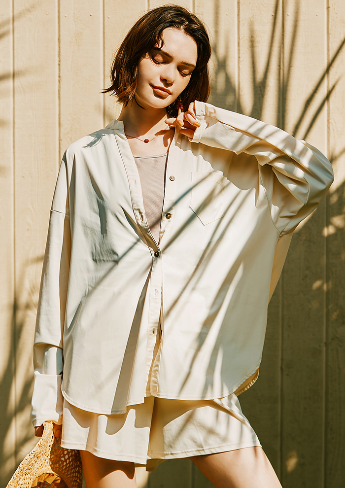 「いろいろなスタイルに合わせやすいシャツは、私のマストアイテム。こちらは、ゆったりとしたシルエットのシャツとショートパンツが付いた4点セット。UPF50+の機能が付いたシワになりにくいストレッチ素材を使用しています。セットの水着は柔らかいリブ素材を使用したシンプルなタンクトップで、ブラ内側には切り替えを入れて、カップがずれにくい工夫をプラス。クロップド丈なのでデイリーのインナーにも使いやすいです! とにかくリラックス感のある着心地がこだわりポイント」。