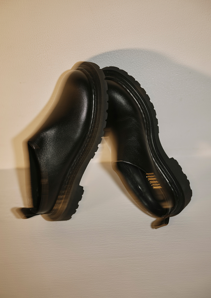 「ミドル丈のバイカーブーツ。筒のサイズは太すぎず細すぎず、スタイルアップするバランスを大切にしています。バックファスナーはデザイン性を保ちながらも着脱しやすい仕様に。ボトムを選ばずエッジの効いたスタイリングが楽しめます」。