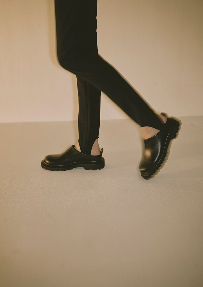 「ワークブーツを軽やかにしたような、踵を落としたデザイン。正面から見るとまるでブーツを履いているかのような一足です。意外にも合わせるボトムを選ばず、またスタイリングに“はずし”が出てスタイリッシュさが際立ちます」。