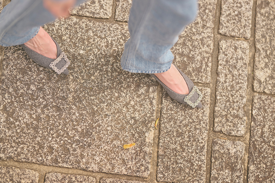「ロングセラーのポインテッドビジューフラットシューズ。今季のグレーフラノ素材は、ハンサムウーマンな表情です」。
