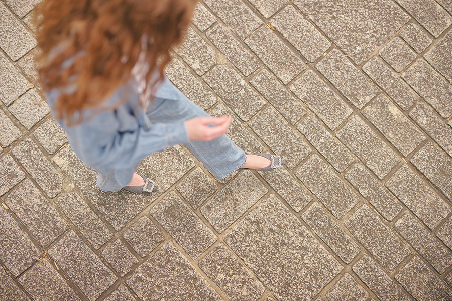 「人気の木型“AMBER”は履き心地が抜群。スタッズのエッジが効いた、モードなフラットシューズです」。