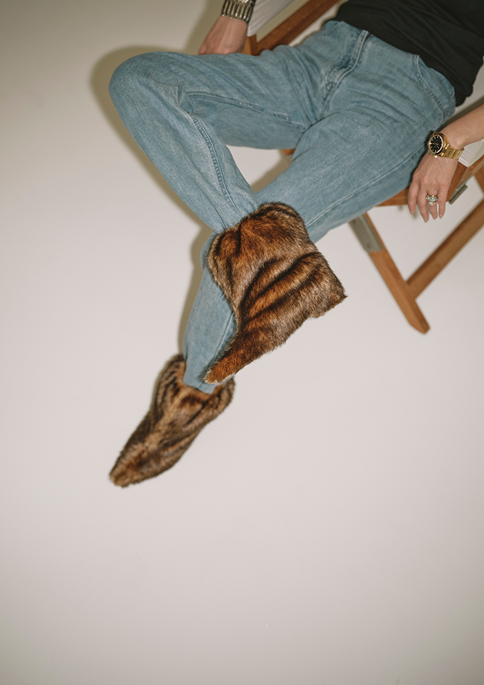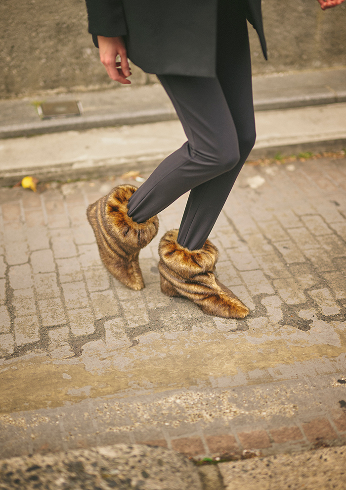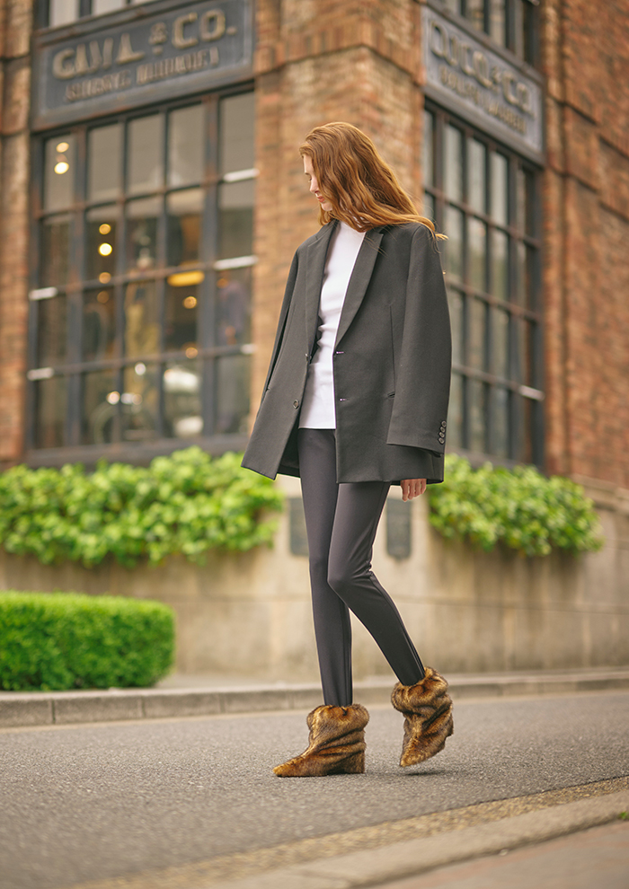 「シャープなポインテッドトゥとコントラストをなすバルーンフォルムが個性的なショートブーツ。履き口はゴム仕様で着脱しやすく、ストレスフリーなヒールはインヒールでアッパーとの一体感がスマート。ecofur brownmixは内外ともにファー素材を施しており、履き心地良く温かいです。まるでマフをまとっているかのような存在感がスタイリングをアップデート。blackはストレッチの効いた合皮を使用し、より軽さが感じられます」。