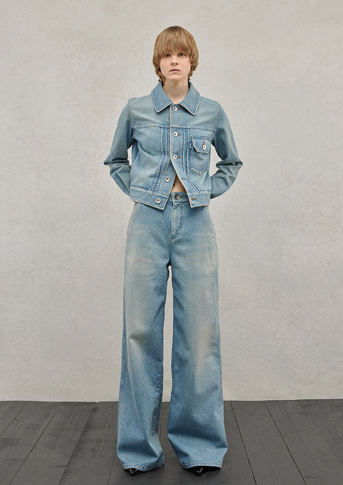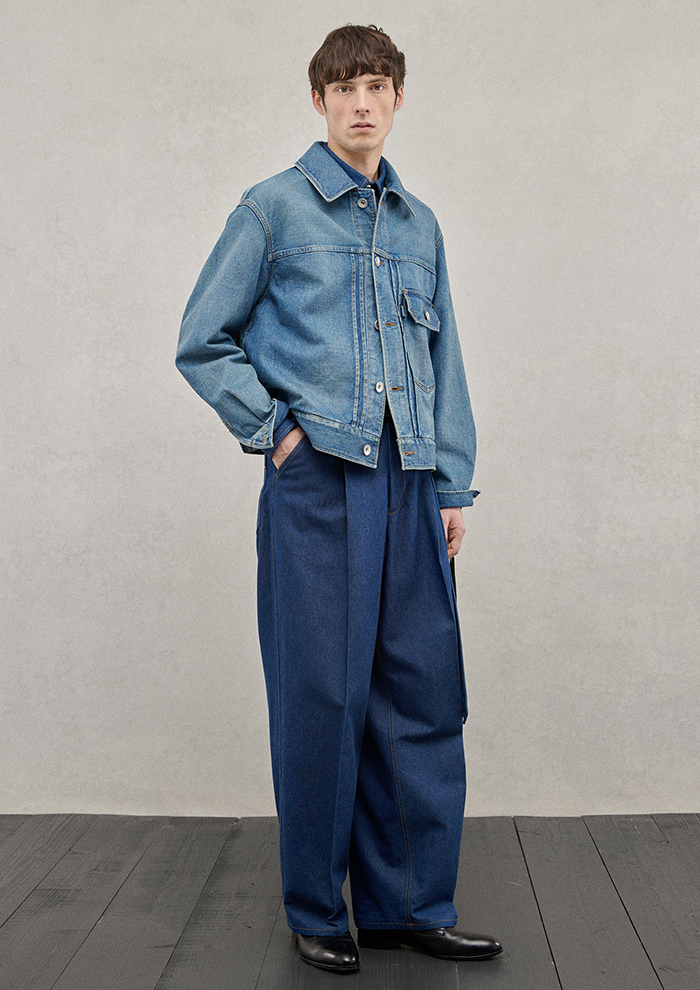 「ここからはメンズをご紹介。まずは、コットン素材のオリジナルレフトハンドデニムを使用したジーンジャケットから。デニムを糸の撚りと同じ方向の左綾で織り上げることで、表面がフラットになり、光沢感としなやかな風合いを併せもつ今までにないデニムジャケットに仕上がっています。ファーストタイプをベースに、ブランドロゴを刻印した大きめのレザーパッチと左胸のみに大きく設けたフラップポケットが特徴。全体的にゆとりを持たせ、身頃はシェイプがなくストレートに落ちるシルエットです。ドロップショルダーや袖丈など、細部までこだわりをプラス。少し柔らかみのあるベージュに振った少し柔らかみのあるベージュっぽいハイトーンのブルーも新鮮に映えます」。
