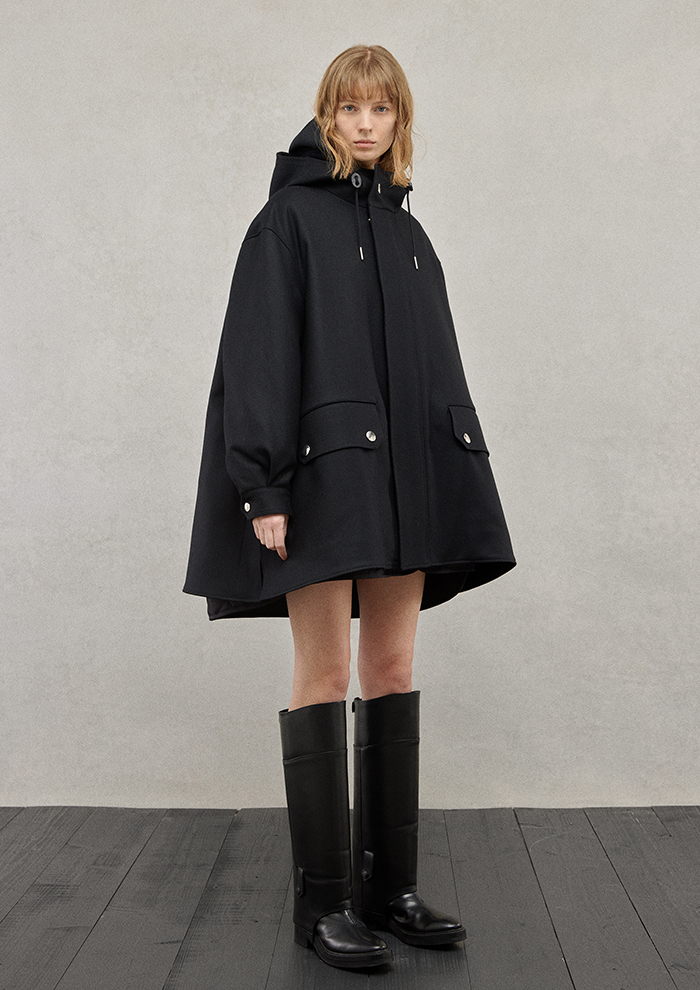 「フランス軍のM-64フィールドパーカーをベースに、「ザ・リラクス」のオリジナルウールメルトンを使用して現代的にアップデートした一着。袖にボリュームをもたせたラグランスリーブで袖口にタックを入れて袖口までボリュームを持たせています。また身頃はバストから下に向かってダイナミックに広がるAラインに。M64の特徴でもある首元と一体型のフードは、ネックのボリュームと立体感が出やすいよう高めのネック設計で全体のバランスを現代的にしています。素材はSUPER140ウールのオリジナル梳毛をベースにしたメルトン素材。トラディショナルなミリタリーアイテムに、最高峰のウールを掛け合わせています」。
