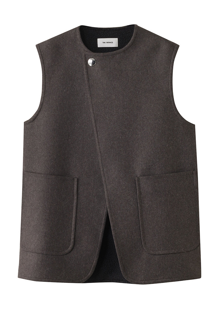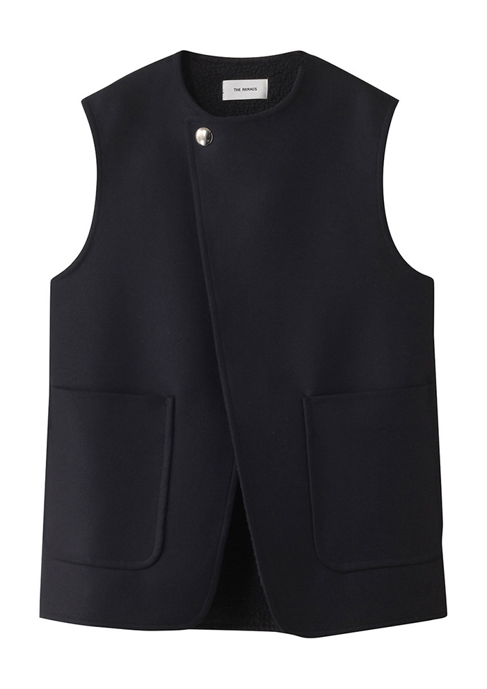 「ジャーキンベストを現代的に再構築した一枚。オリジナルのドットボタンとパッチポケット、フロントのラウンドヘムが、武骨な印象を中和しています。アームホールのかま底を低めに設定することでゆとりが生まれ、バストから裾まで直線的なシルエットを実現。身幅も広く、着丈も長めのため、アウターの上からでも羽織ることが可能です。表面にはハリのあるフランネル、裏面は「ポーラテック」社フリースを使用し、上質感と、軽さ、保温性を併せ持った、デザイン性と機能性に優れたアイテムです」。