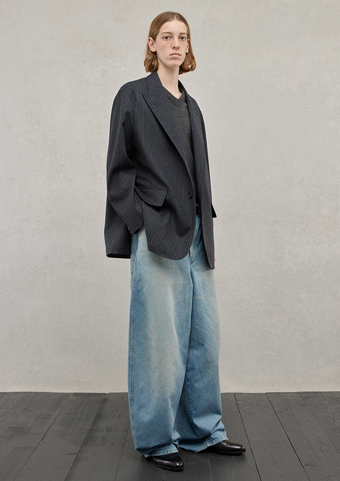 「こちらはデニム生地を使用したワイドパンツ。わたりが非常にワイドで、裾までカーブを描きながらテーパードする、立体的かつダイナミックなシルエットです。ヒップや脇のラインも、まるでスラックスのようなエレガントさ。ヒップまわりの曲線が美しく表現できるウエストのカーブベルトもポイントです。ブランドロゴを刻印した後ろの革パッチ部分、フロントの重厚感のあるタックボタンなどがアクセントに。こちらも生地は一般的なデニム生地とは逆綾組織の、左上がりに織り上げたレフトハンドデニムを使用。少しベージュ味のあるハイトーンのブルーが印象的で、はき込むほどに経年変化が楽しめます」。