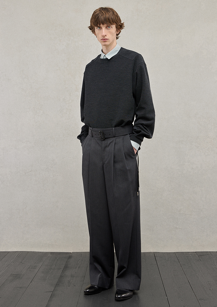 「オリジナルのウールフランネル素材を使用したベルテッド2タックスラックス。フロントはアウトタックでゆとりのある腰まわりにし、そこから裾に向かってストレートに直下する、ダイナミックなワイドシルエットの一本です。同素材のベルトを付けることで、より洗練された印象に。素材は、2/72番手の梳毛のウールを高密度のサージ組織に織り上げ、時間をかけ縮絨を繰り返し圧縮した、頑丈かつハリ感のある素材。さらに独自の含浸加工を施し、フランネルの起毛感を抑えているため、立体的なシルエットが形成できます」。