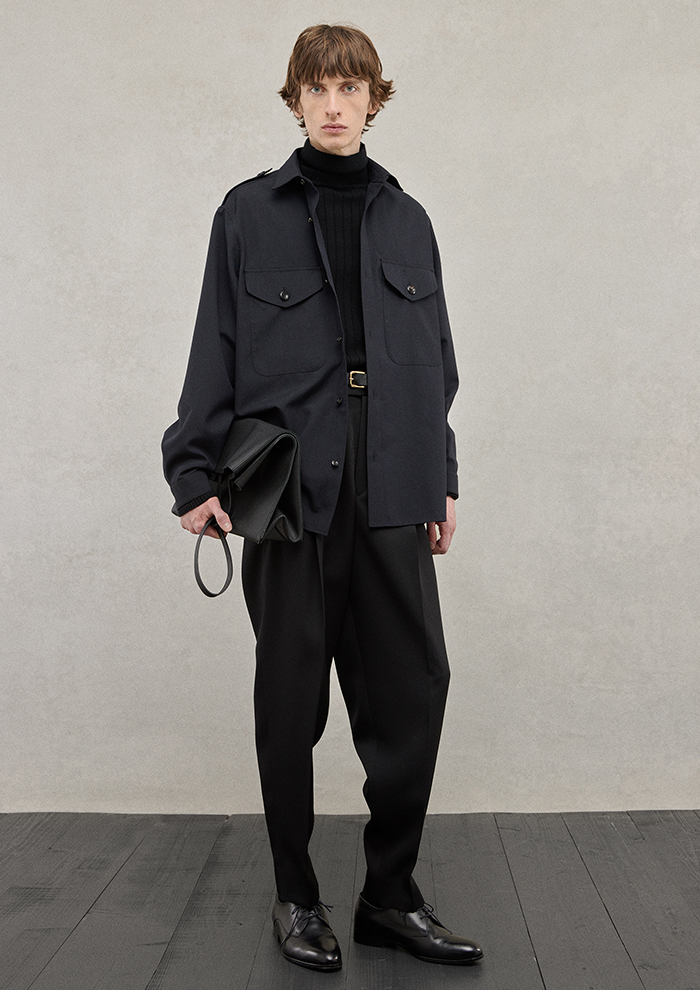 「ウール・ポリエステルの梳毛素材を使用したミリタリーCPOシャツです。アメリカ海軍に支給されていたシャツをベースとしたカジュアルなブラウスを現代的にアップデート。肩まわりに施したエポーレット、大きめのパッチポケット、たっぷりとボリュームを持たせた袖が特徴的です。肩まわりと袖はゆったりとさせ、少し長めの袖によってカフスがブラウジングされ、袖口のタックがさらにボリュームを演出。軽やかでほどよいハリ感のあるウール・ポリエステル素材の風合いと独自のパターンが、ミリタリーアイテムをモダンに進化させた「ザ・リラクス」ならではの一枚です」。
