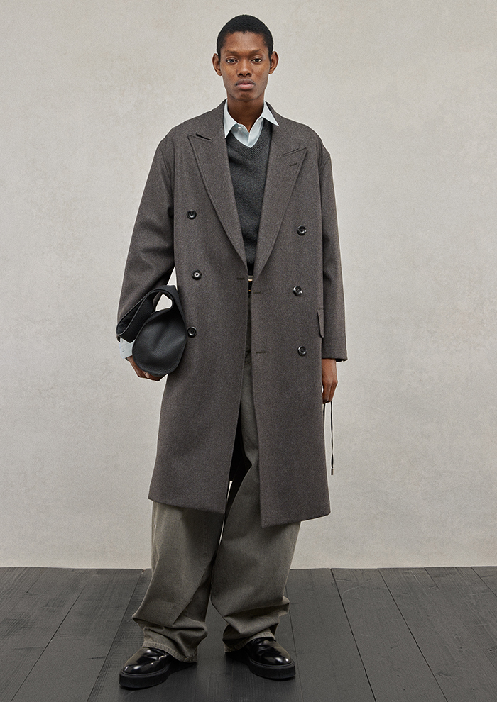 「こちらは、ブランド定番のブリティッシュメルトン素材を使用したダブルピークドイージーコート。裏地のない軽い着心地と体にフィットしやすく動きやすいパターン設計にした、本格的テーラードを気負いなく日常使いできる上品な一着です。肩まわりはゆとりのあるショルダーでありながらも、完全にドロップせずセットインの雰囲気を持ち合わせた設計に。返り線を低めにすることで、どうしても堅苦しくなるダブルブレストにリラックス感を加え、かつラペルは幅広でゴージラインを低めにし、肩幅が張って見えないようにこだわっています。素材は英国羊毛をベースにSUPER140ウールを組み合わせたオリジナルのブリティッシュメルトン。経年劣化にも強いメルトン素材です」。