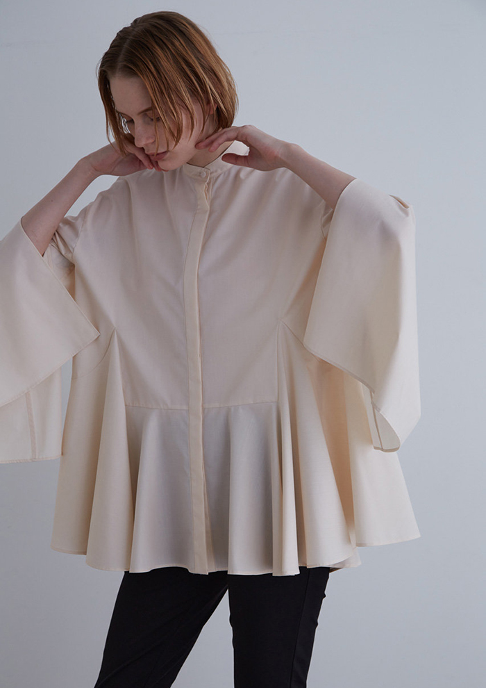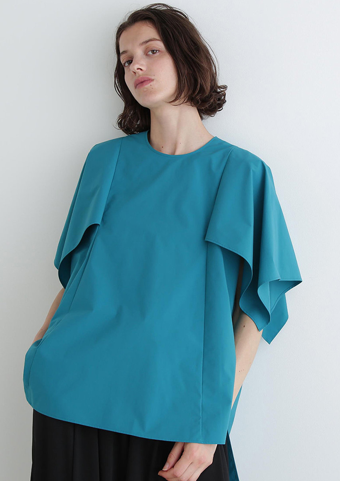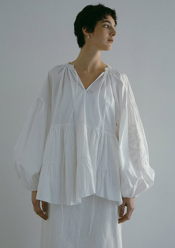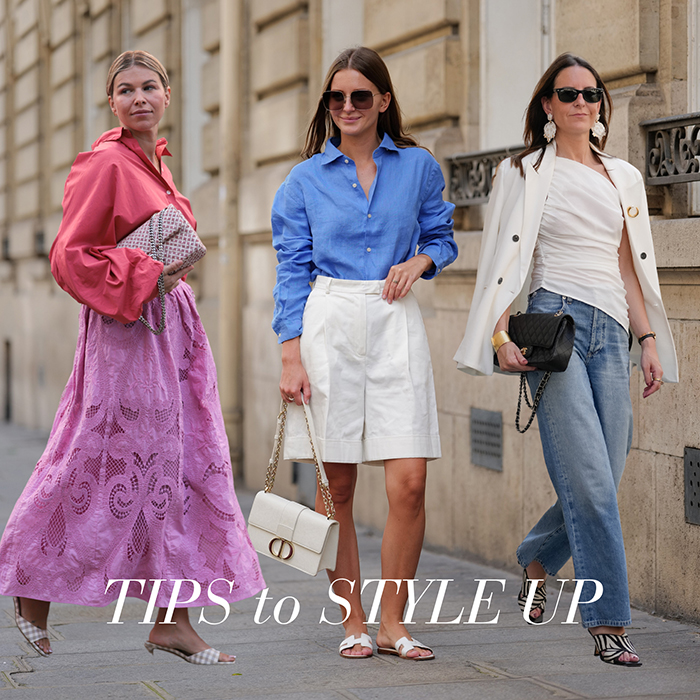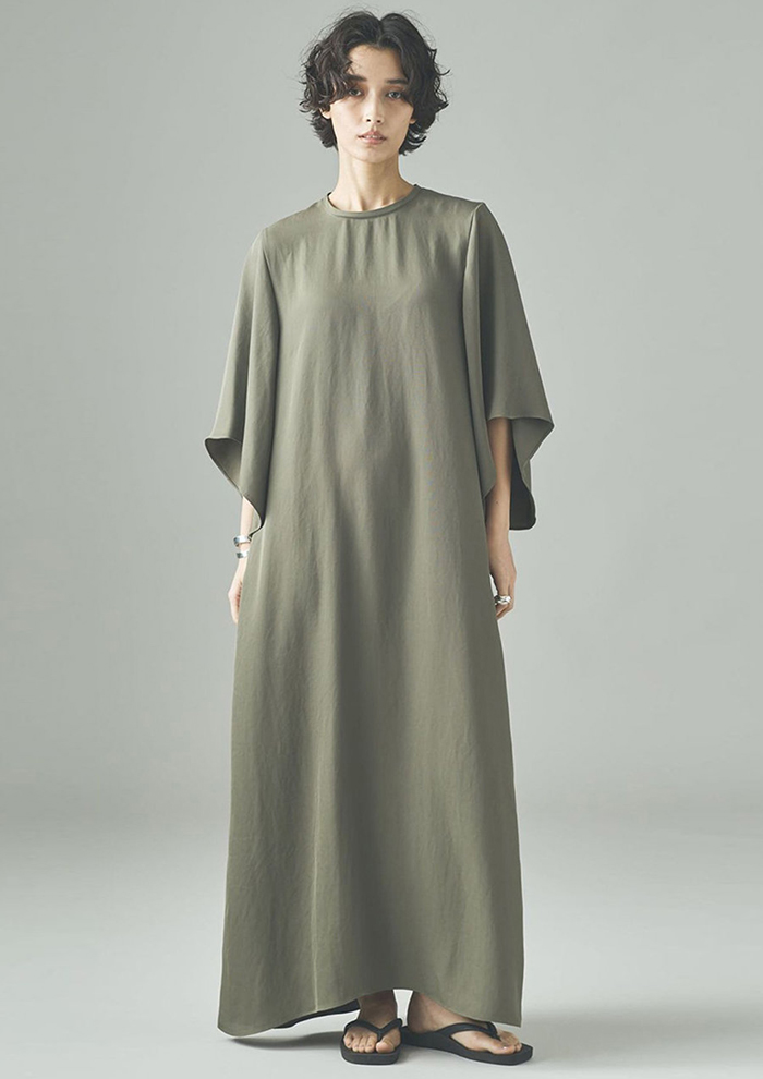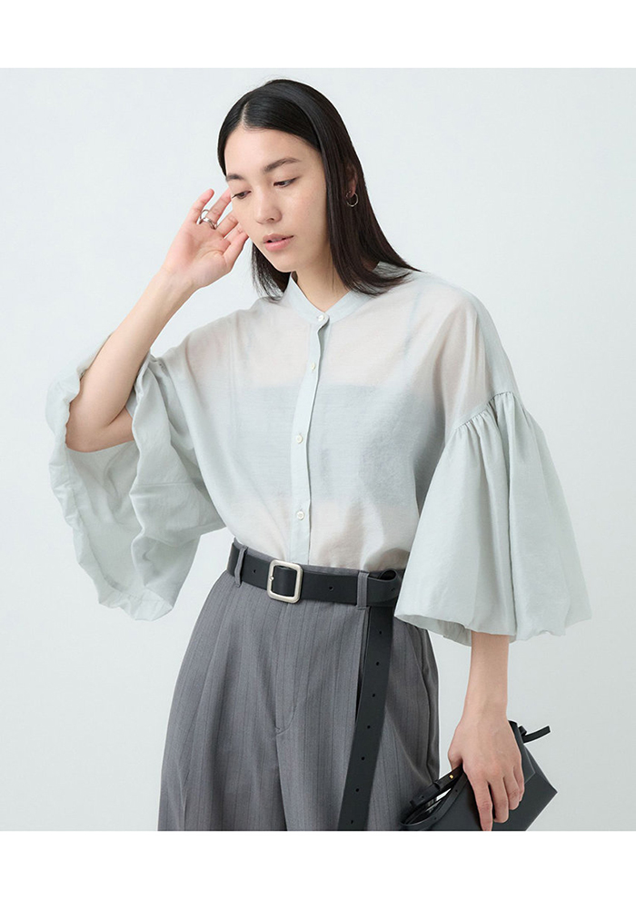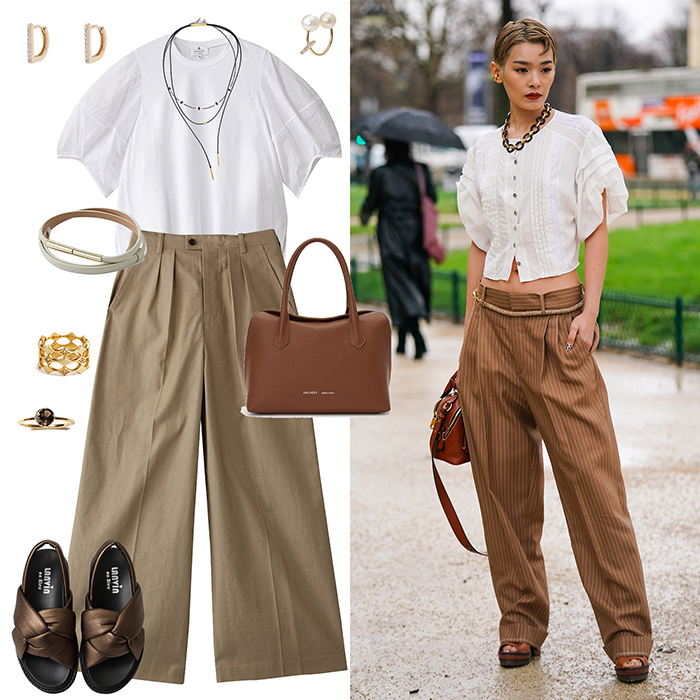 袖コンシャスなトップスや腕周りにゆとりのあるデザインは、おしゃれに見せつつ二の腕をカバーするのにぴったり。肩にボリュームがあるデザインより袖にボリュームのあるデザインを選ぶのが正解。首元を開けて抜け感を作ったり、ボトムスをコンパクトにまとめてすっきりとした印象に。