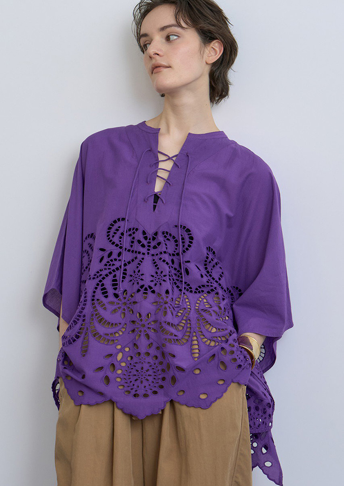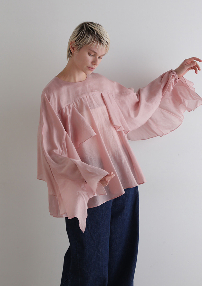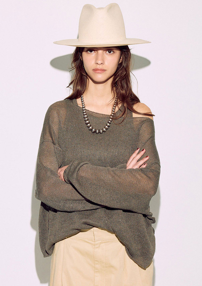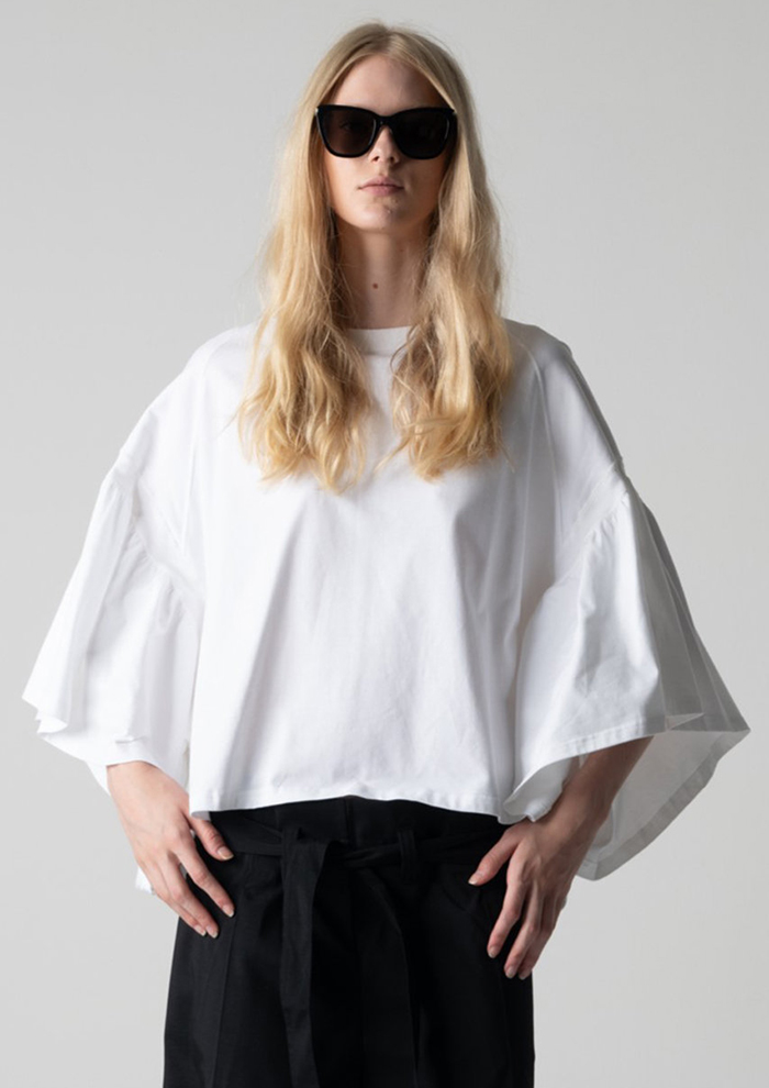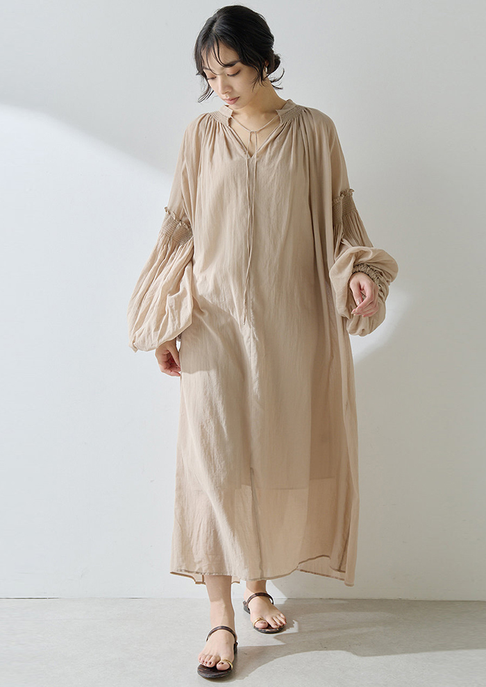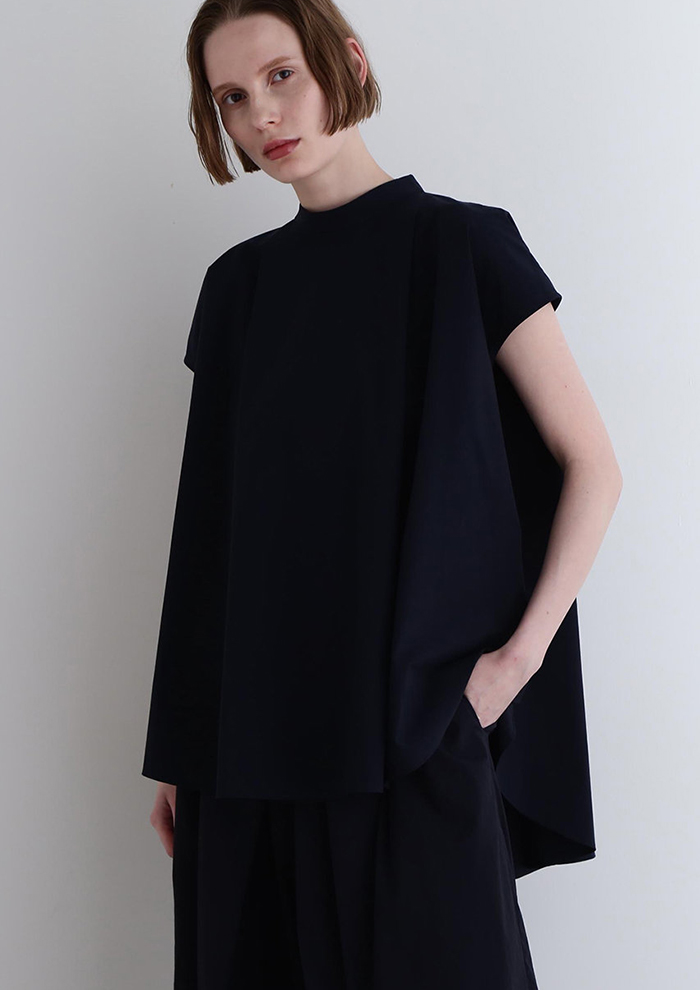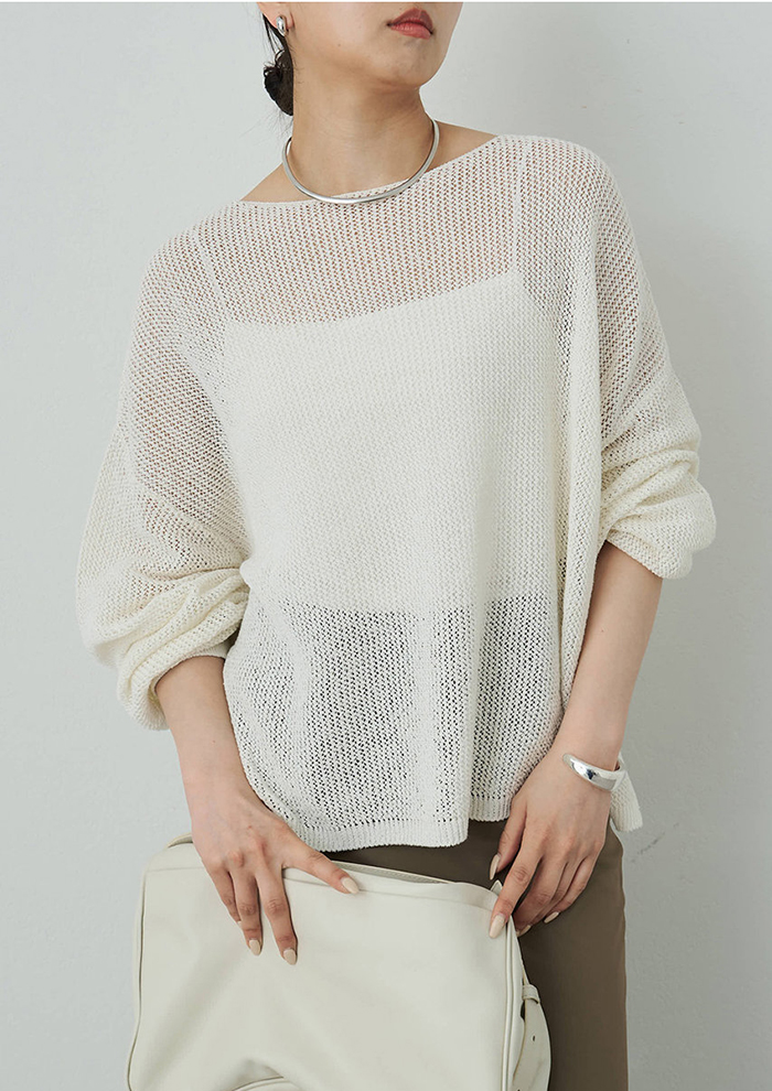 袖コンシャスなトップスや腕周りにゆとりのあるデザインは、おしゃれに見せつつ二の腕をカバーするのにぴったり。肩にボリュームがあるデザインより袖にボリュームのあるデザインを選ぶのが正解。首元を開けて抜け感を作ったり、ボトムスをコンパクトにまとめてすっきりとした印象に。
