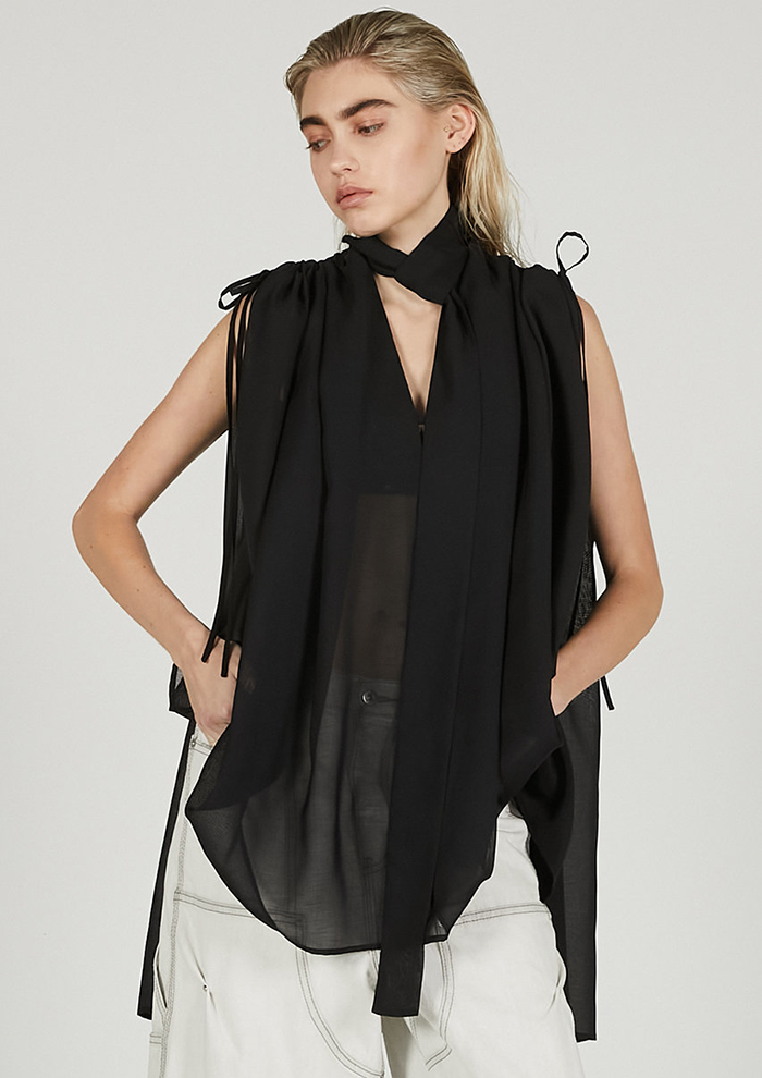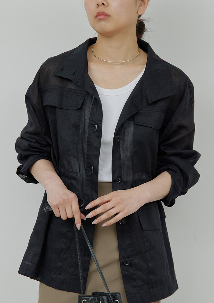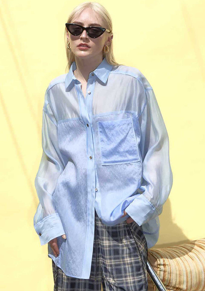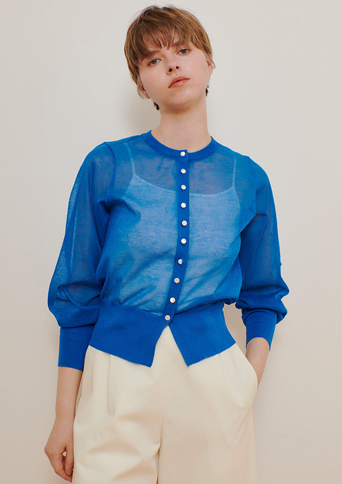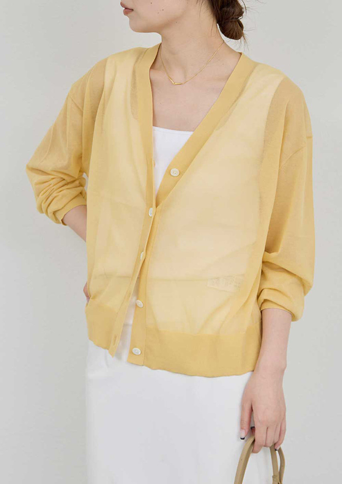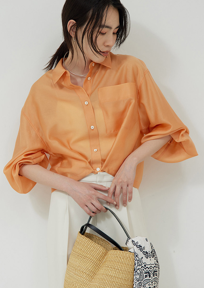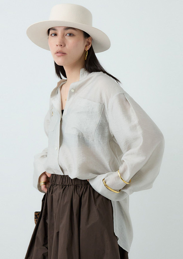 腕は出したくないけどノースリーブが着たい時やTシャツ一枚だと気になる時は、カーディガンやジャケットの袖を通さず肩に羽織るだけでこなれた印象に。定番になりつつあるシャツの肩かけも、シアーシャツを選べばトレンド感たっぷりなコーデが完成。