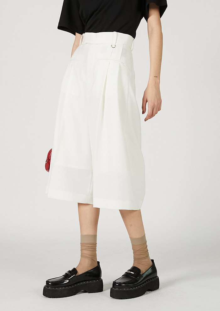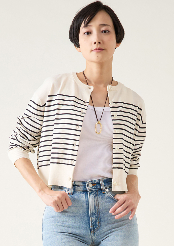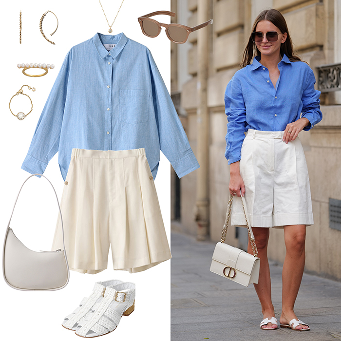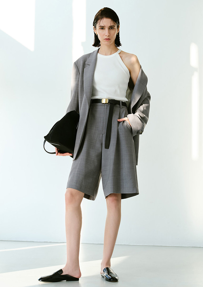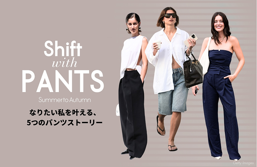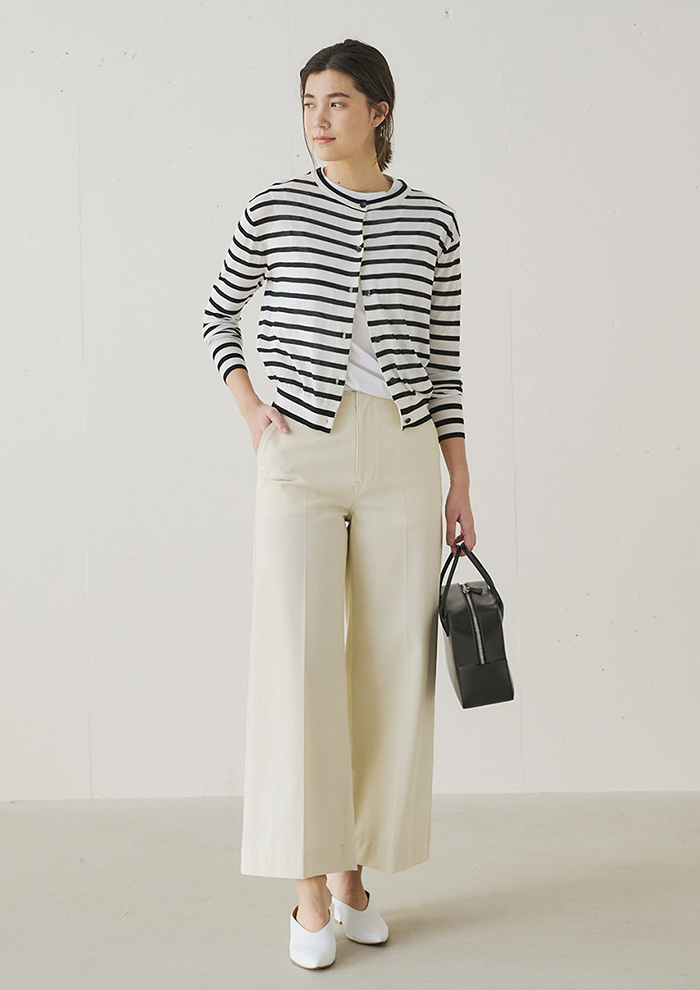 脚のラインを拾いにくいデニムやチノパン、ツイルなどのしっかりとした生地のパンツは、ヒップや太ももカバーに最適。足元に抜け感を出し、視線を分散させてくれるハーフパンツもおすすめです。今季は長め丈のハーフパンツも出ているので、大人に似合うきれいめコーデにも取り入れやすいですよ。