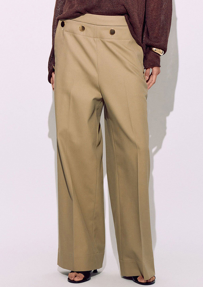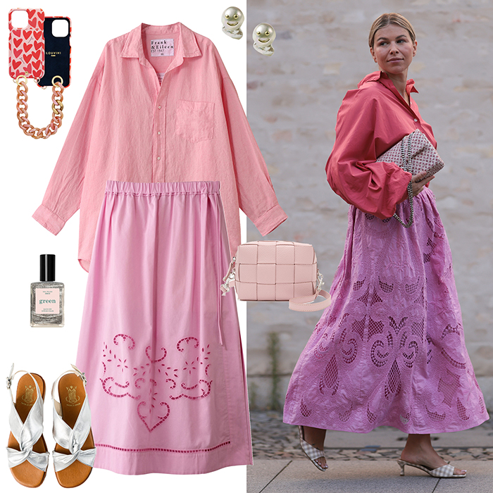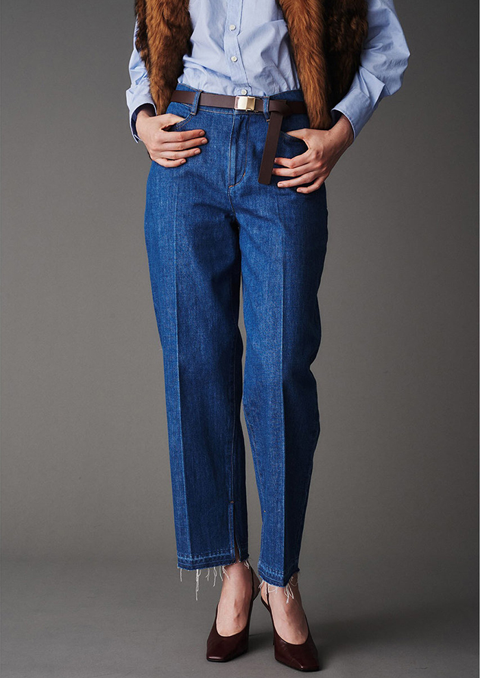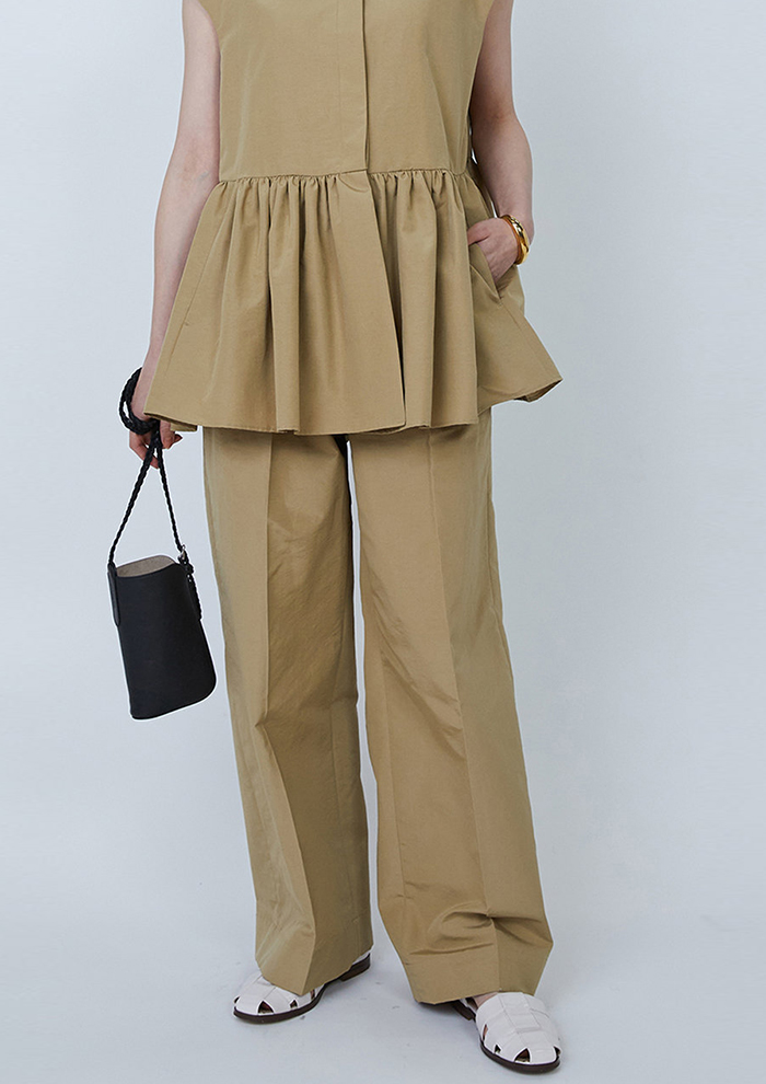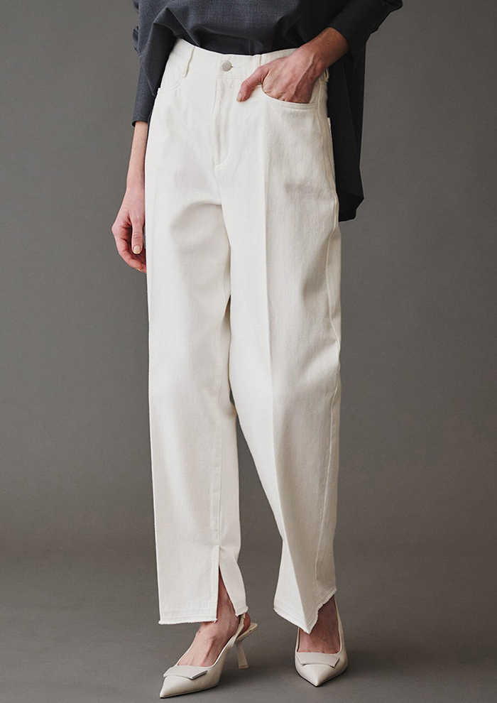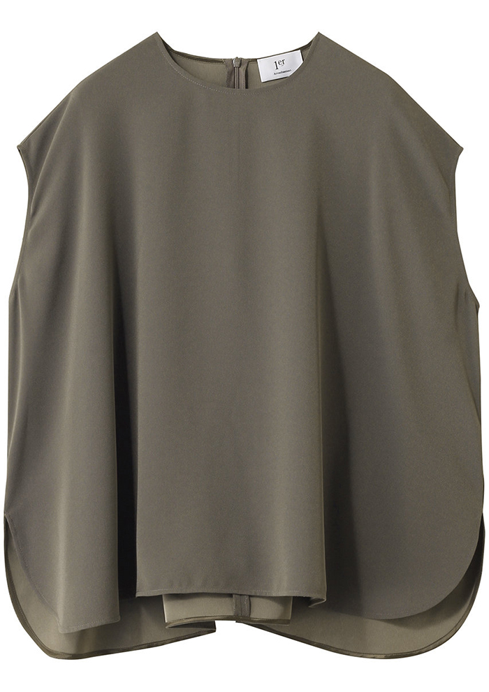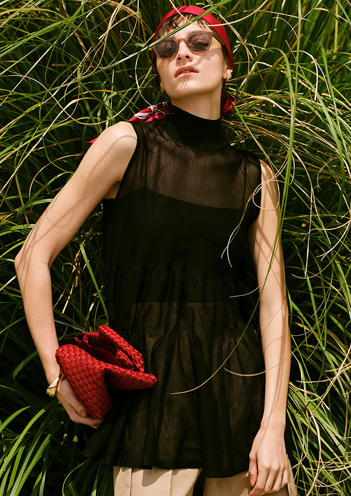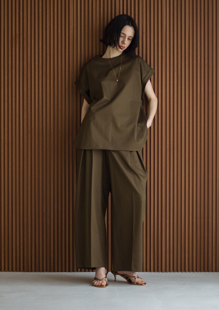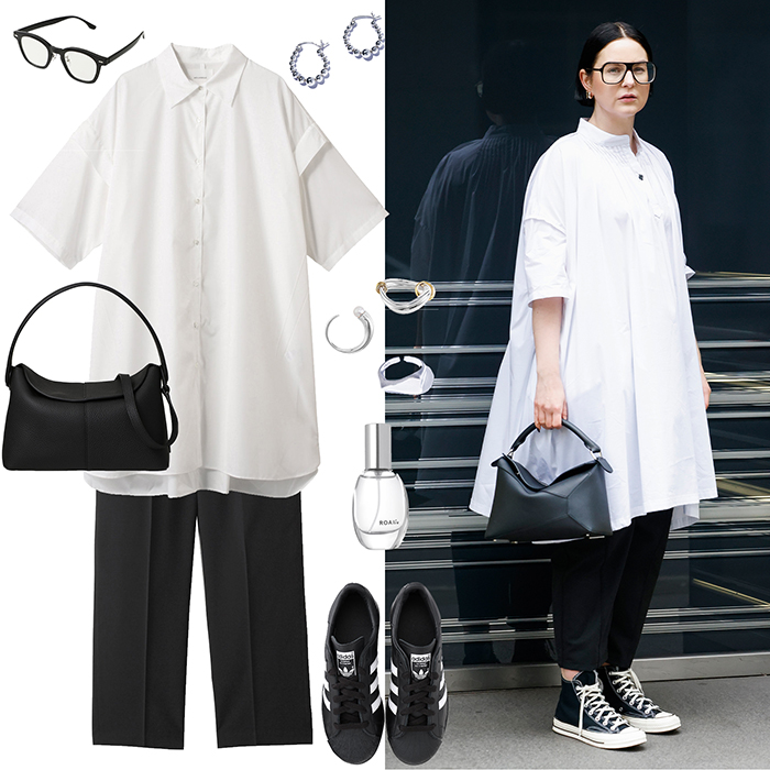 ゆったりシルエットや、お尻が隠れる長めのトップスは体のラインを拾わないものの、合わせるアイテムを間違えると余計に膨張して見えてしまいます。ボトムスにはストレートパンツやタイトスカートなど縦長ラインを強調できるアイテムを合わせるのが正解。ワイドパンツなどボリュームのあるパンツを合わせる時は、トップスの前をパンツにインしてメリハリをつけて。インするのに抵抗がある方は、シアー素材のトップスを選んで抜け感を出せばOK。シアー素材のインナーにはブラックやダークカラーを入れるとより引き締まります。