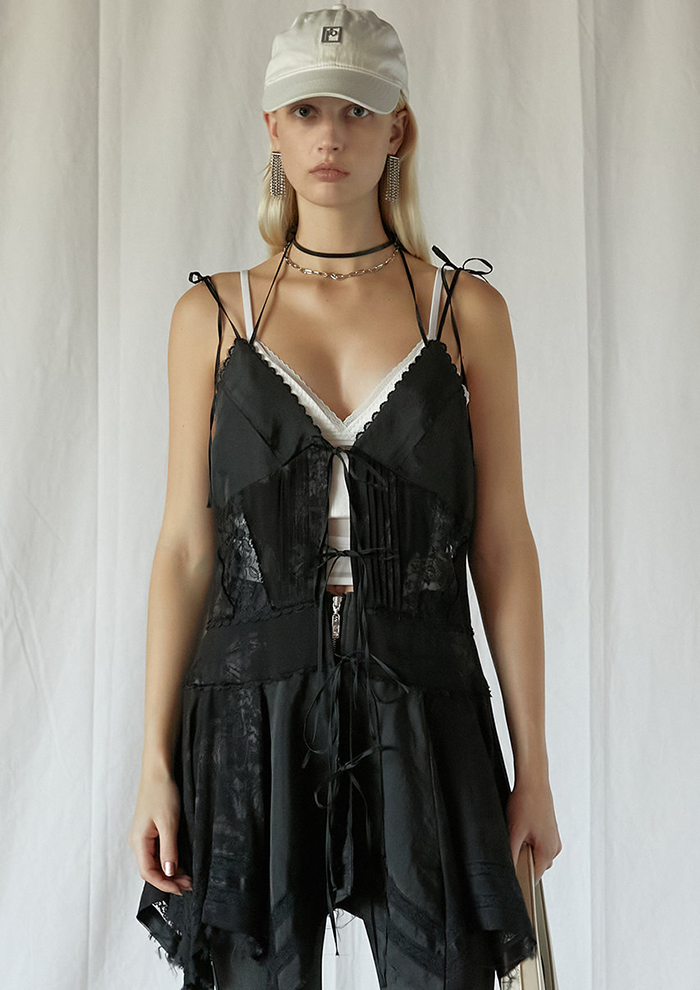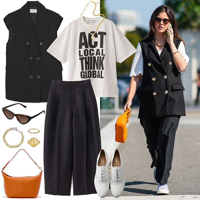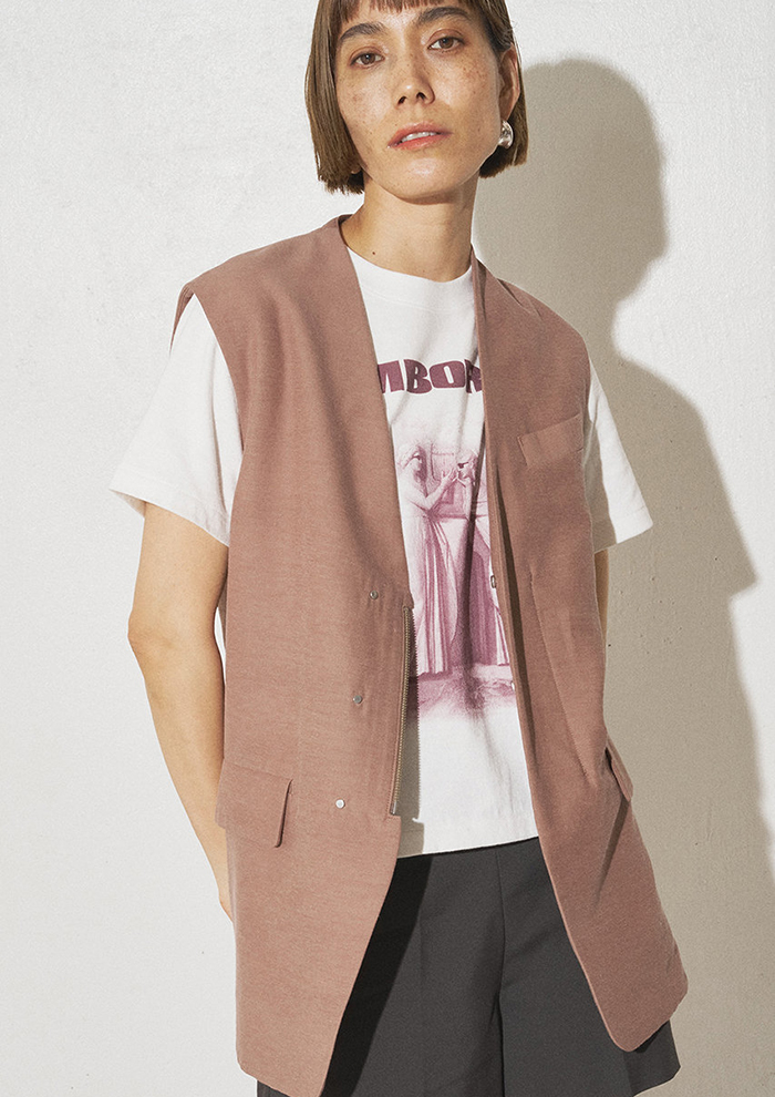 Tシャツ一枚だと心もとないという時にプラスしたいのが長め丈のジレやキャミソール。いつものコーデに重ねるだけで、華やか見えする縦長シルエットが完成。