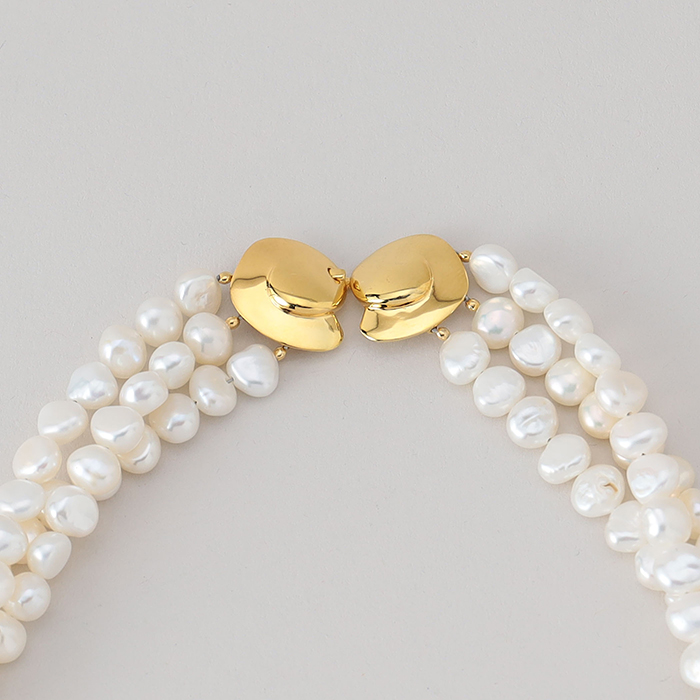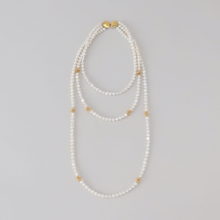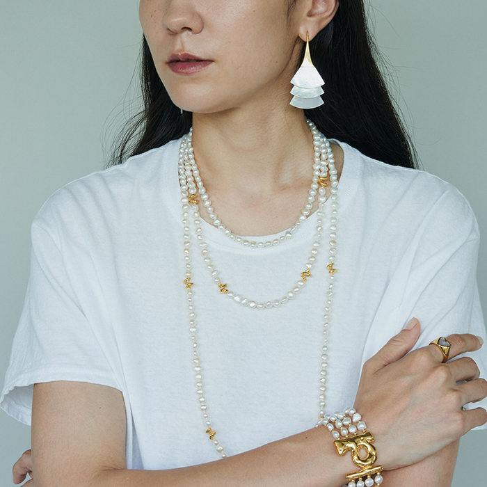 「“Baroque Pearl”シリーズには、長さ違いのロング3連ネックレスも。パールを重ねづけしていた1920年代のフラッパースタイルから着想を得ています。シンプルなシャツやニットといったプレーンな装いにも、これをプラスするだけでぐんと洗練された印象に。オリジナルの留め具モチーフや、パールの間に挟み込んでいるクルクルとしたツイストモチーフも遊び心が効いたデザイン。きれい目はもちろん、Tシャツやデニムなどのカジュアルスタイルにもさらっとマッチします」。
