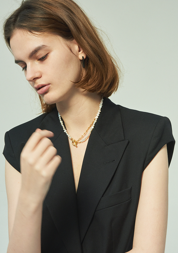 「バロックパールの有機的で温かみのあるカーブをあえて生かし、純シルバーにゴールドプレーティングの特殊加工“PREEK Dip Coating”を後ろ1粒のみハーフサイドに施しています。パールとメタルの異なる曲線が、コンテンポラリーかつエレガントな雰囲気を演出。ユニセックスで着用できます」。
