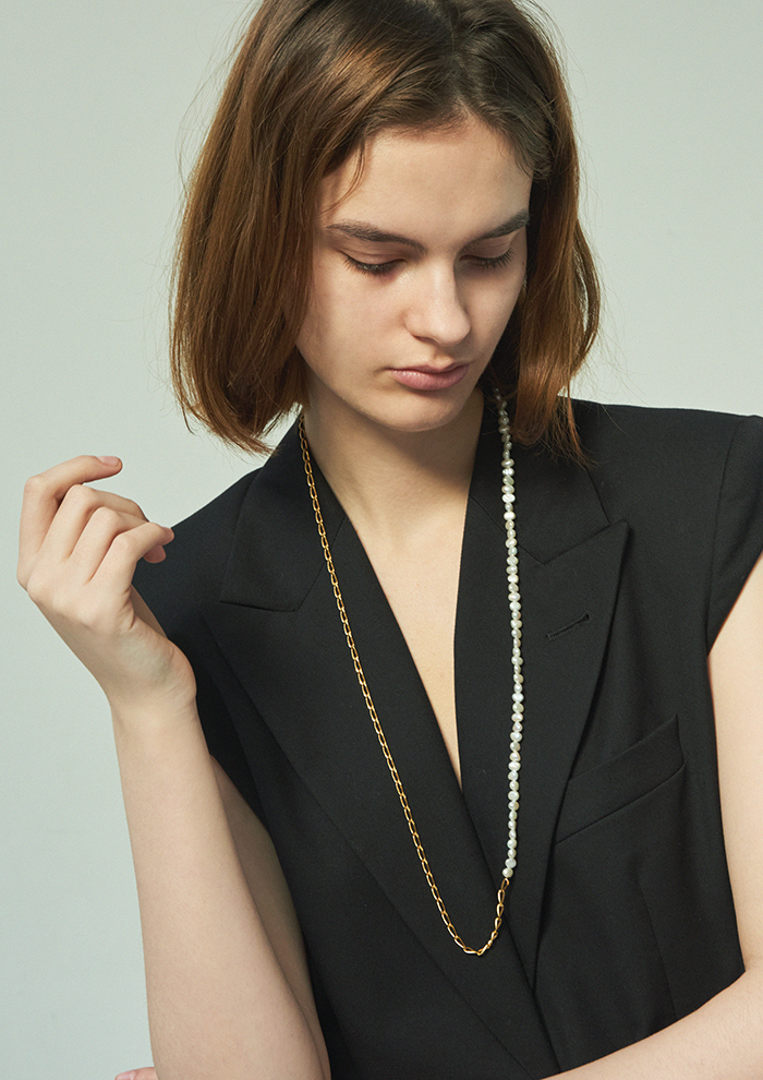 「“Baroque pearl”シリーズの新作は、6~7mm玉のバロックパールとチェーンを組み合わせた3WAYロングネックレス。ロングのままでも、2連使いでも、またマンテルをフロントに持ってきても◎。1本でさまざまなつけ方が楽しめます。こちらもユニセックスアイテム」。