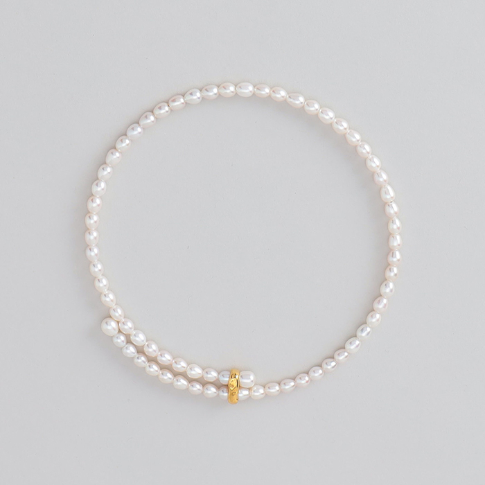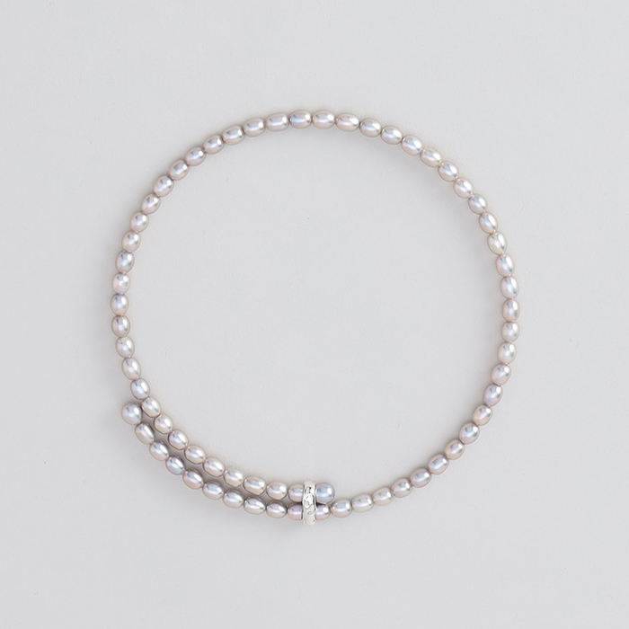「こちらは、形状記憶ワイヤーを使用したバロックパールのドッグネックレス。付属の留め具によって、好みのパール位置で長さ調整できます。パールをチョーカー感覚で気軽に楽しめる「プリーク」のパール入門編。ホワイトとグレーパールの2色展開です」。