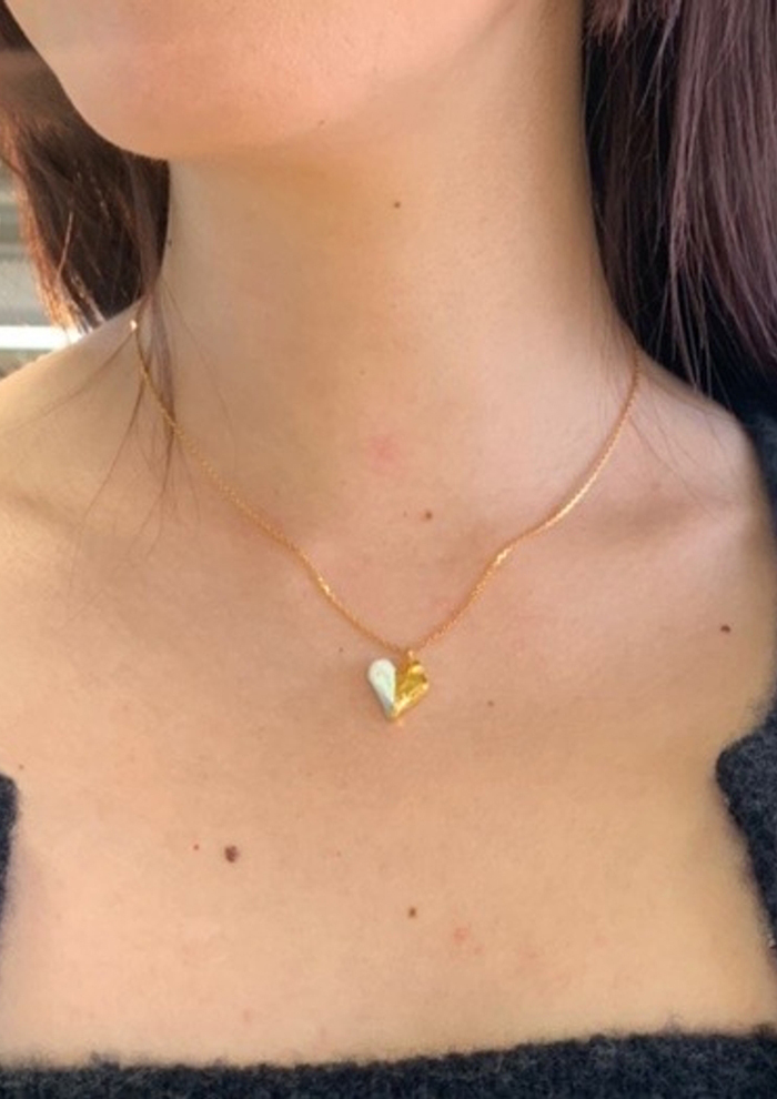 「形の歪んだハートチャームが甘すぎない大人な印象のハートチャームネックレス。こちらは白蝶貝を宝石彫刻の伝統工芸技術でハートモチーフに削り出し、純シルバーにゴールドプレーティングの特殊加工“PREEK Dip Coating”をハーフサイドに施しています。ひとつひとつ手作業なのでハートの形には個体差があります」。
