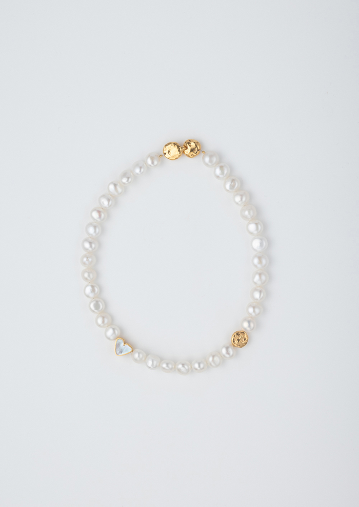 「10~11mm玉のバロックパールの間に宝石彫刻の伝統工芸技術で削り出したハートモチーフとゴールドプレートを配したネックレス。ゴールドプレートには“自由・平和”の象徴であるハートモチーフを描いています」。