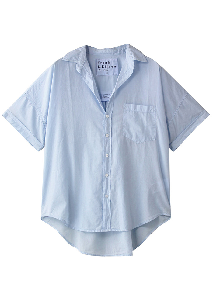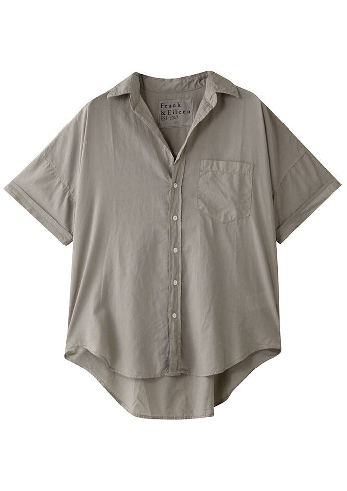 「「フランク&アイリーン」の半袖シャツ“ROSE”は、コットン100%のオーガニックボイルでほんのり透け感があり、夏の肌にやさしくて気持ちいい! ゆとりのある前後差ボディも風通しが良く、汗ばむ日でも肌にはりつかずにさらっと着用できます。すぐに乾いてシワになりにくく、サマーリゾートでの軽い羽織や日差し対策としてもおすすめ(バイヤーNAO)」。
