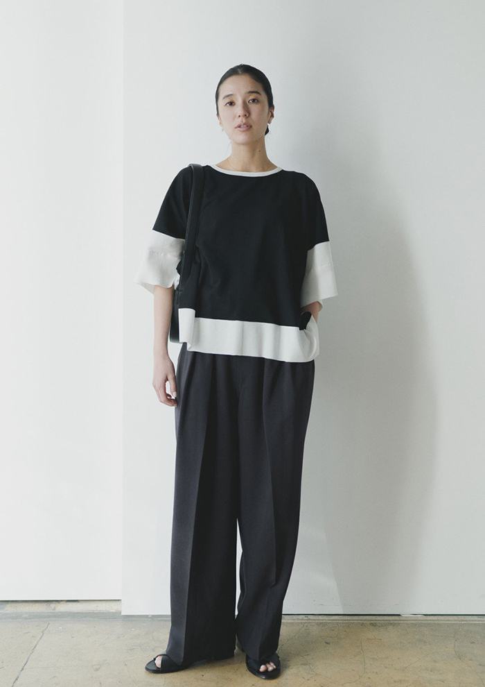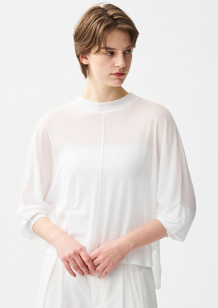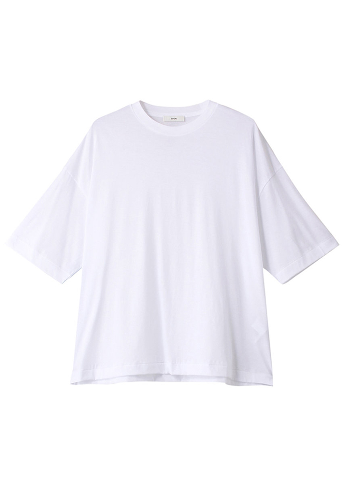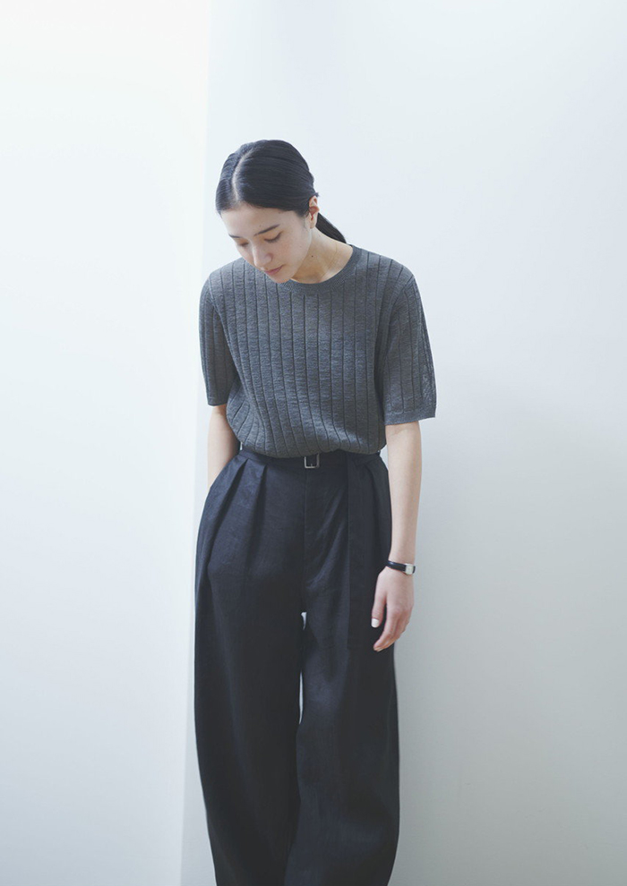 「ドライタッチな肌触りと、涼感を感じさせるほどよい透け感を両立した一枚。強撚糸ならではのシャリ感に、細番手のハイゲージ編みによるほのかな光沢と美しいドレープが重なり合った「エイトン」らしい洗練されたアイテムです。定番のオーバーサイズシルエットはそのままに、ボトムアウトでもすっきりきまるよう、着丈をやや短めにモディファイ。太めの襟元と、肘にかかる長めの袖が、まるでメンズTシャツをまとったかのような抜け感を演出(バイヤーHARUMI)」。