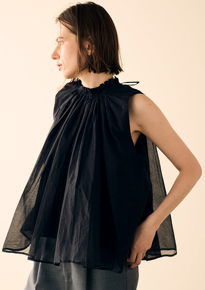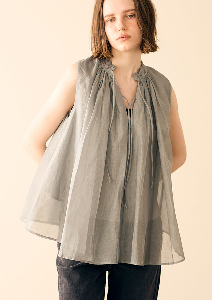 「ほんのり透けるシアー感が、見た目にも涼しい前後2WAYトップス。ハリのあるコットン素材が、ふんわりと肌から浮くような軽やかさを演出します。たっぷりと寄せたギャザーが立体感を生み、1枚でサマになる主役級トップス。同素材のスカートやワンピースもぜひチェックしてみてくださいね(アシスタントバイヤーMAKI)」。