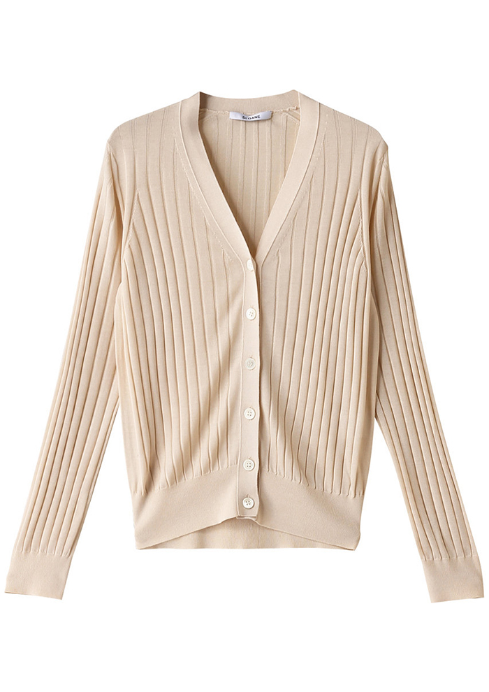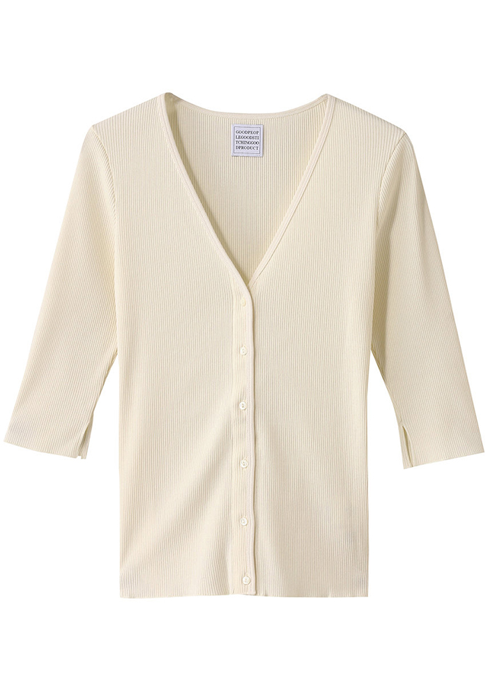 「この夏の日差し&冷房対策に頼れるのが「グッド ピープル グッド ステッチング グッド プロダクト」のカーディガン。ブランドこだわりの柔らかくてとてもシルキーなコットン100%のリブ素材です。毛羽立ちが少ないドライタッチな着心地が魅力。Vネックと袖丈、ほどよいフィット感によって女性らしく着こなせます。キャミソールの上からさっと羽織って、フロントボタンを開けて肌見せしても◎(アシスタントバイヤーNARUMI)」。