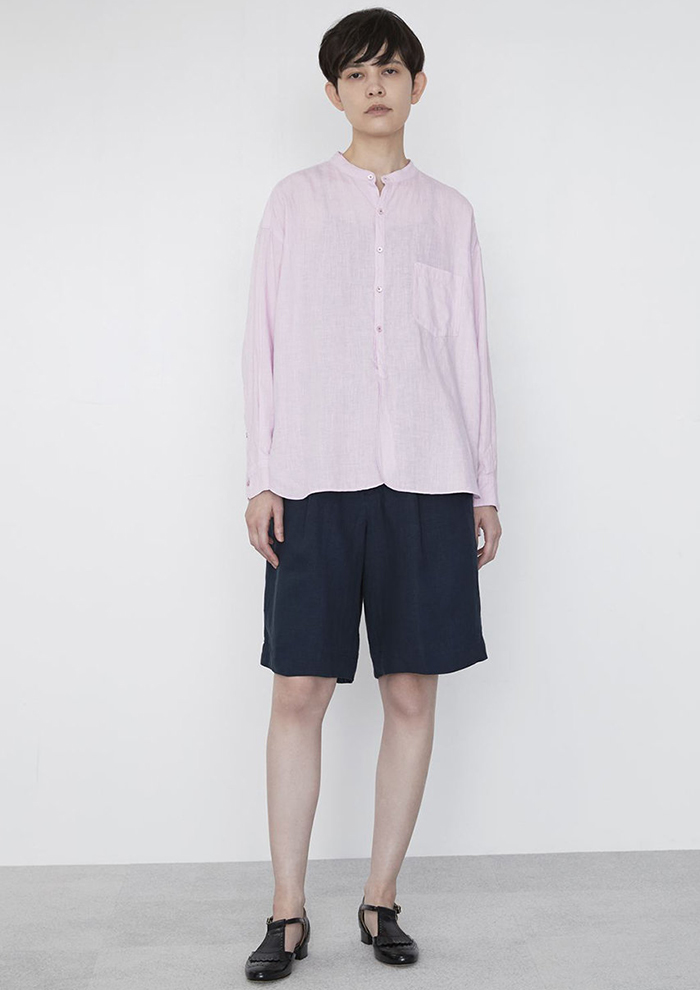 「国産リネン100%のスタンダードなノーカラーシャツは、汗ばむ季節もサラサラの肌触り。お洗濯を重ね、リネンならではの肌なじみの変化を楽しみながら、きれいで上品な表情がずっと続きます。羽織としても使えて、日よけや冷房対策にも大活躍!(バイヤーYUKA)」。