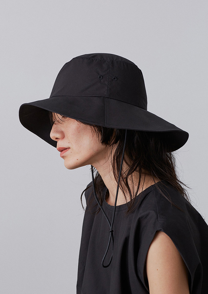 「こちらは「イレーブ」×「キジマ タカユキ」のコラボハット。高密度に織られたSUVINコットン混素材による、なめらかさで上質なハリ感が魅力です。紐が取り外し可能なうえ、前後で長さの異なるつばのシルエットがカジュアルにもエレガントにもグッドバランス。レジャーからリゾートまで、幅広いシーンで活躍します(アシスタントバイヤーNARUMI)」。