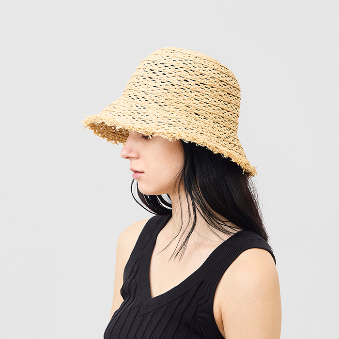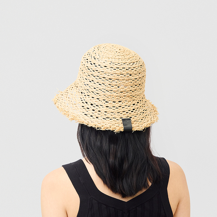 「ざっくりとした編み目が涼しげなラフィアハットにもご注目を。通気性に優れ、コンパクトにかぶれるデザインは、夏のお出かけにぴったり。バックのレザータグがさりげないアクセントとなり、ワンランク上のおしゃれを実現!(アシスタントバイヤーRINA)」。