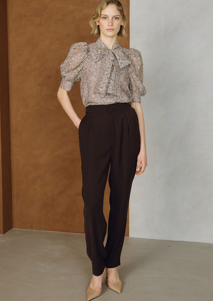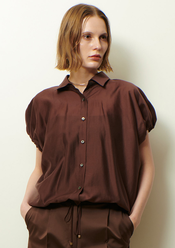 「まずは、秋気分たっぷりのマロンカラーのアイテムから。ギャザーを寄せた袖口と、ウエスト部分の裾のドローストリング仕様がこなれた雰囲気です。ほどよく透け感のある生地のため、今からでも涼しく着用可能。無理のない季節の先取りはこのブラウスから(バイヤーTAKASHI)」。