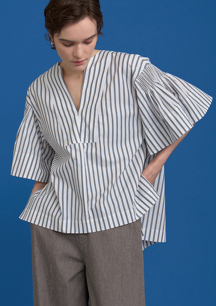 「風通しがよく一枚で着映える「ハウス オブ ロータス」のデザインブラウスは今からぜひ押さえたい! フレアスリーブもシャツ生地なら甘さ控えめでハンサムに着こなせます。デコルテをきれいに見せる気持ち深めのVネックが、真夏でも爽やかなスタイリングを実現(バイヤーNAO)」。