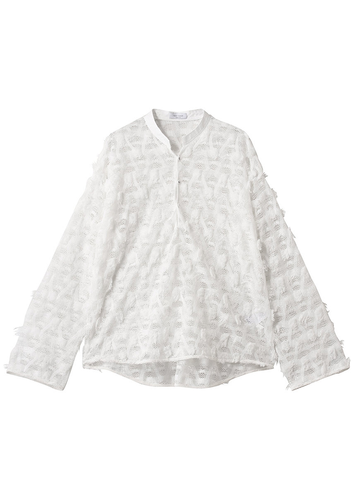 「秋も引き続きトレンドのシアーは、ほんのり季節感を感じさせる素材でニュアンス感をプラスして。こちらは、幾何学柄にポンポンのようなフサを散りばめた個性派レースのブラウス。2種類の糸で編まれた立体感が魅力です。伸縮性のあるポリエステル素材のため、ご家庭で洗濯できるのもうれしいポイント(バイヤーHARUMI)」。