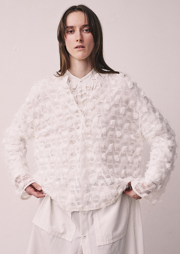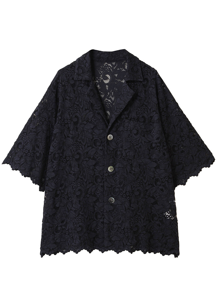 「レースのブラウスとジャケットのいいとこどりをした新作アイテム。「サードマガジン」らしい、カジュアルとエレガントのバランス感がポイントです。レースの軽やかで涼しげな感じと、ほどよい品の良さで、人気が出そうな予感!(バイヤーTAKASHI)」。