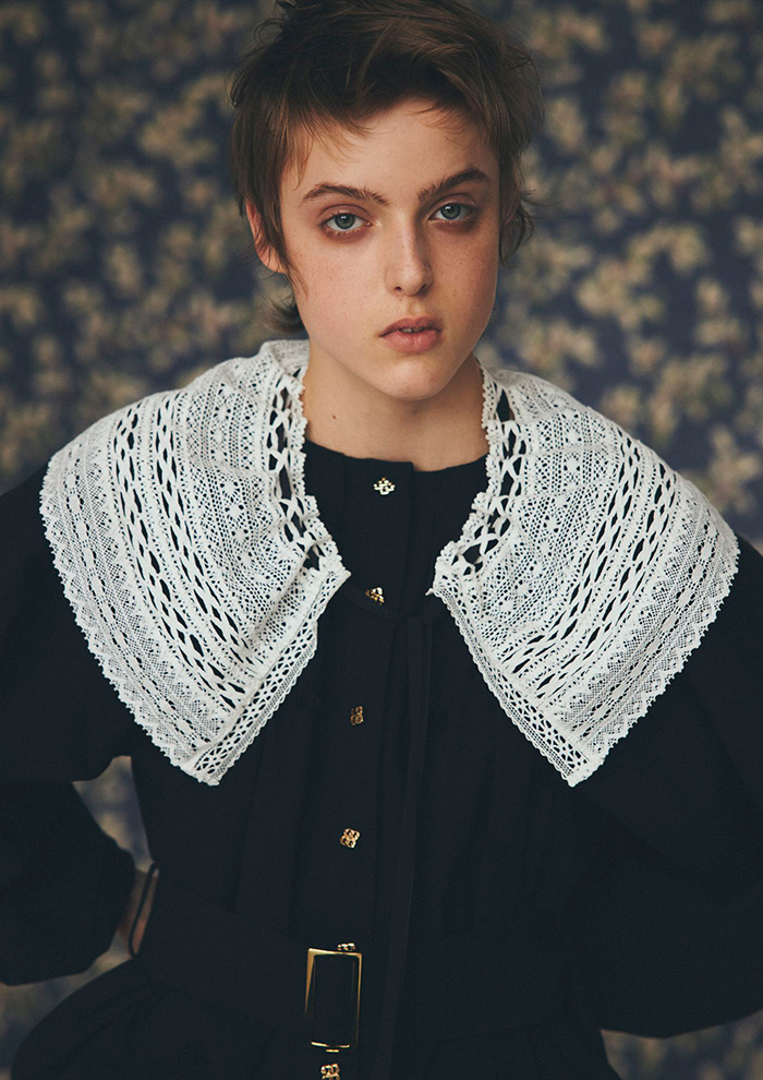 「「ミュベール」からは、レース編みを施したチュニックプルオーバーをご紹介。キッドモヘヤを使用した糸でふんわり仕上げています。取り外し可能な襟は細いレーステープをパッチワークした繊細なデザイン。シンプルなワンピースやトップスに合わせたり、レイヤードを楽しんだり、スタイリングにアクセントを添えるアイテムです(バイヤーYUKA)」。