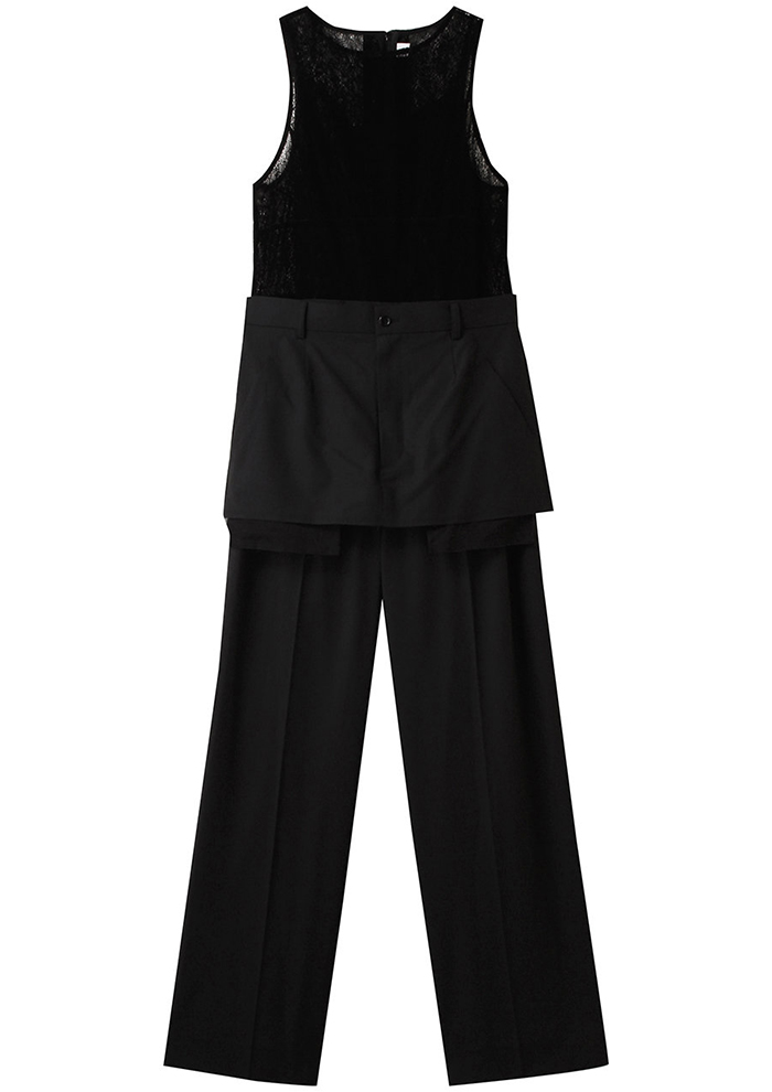 「今の時期から活躍するのがノースリーブのコンビネゾン。上品な透け感のあるフェミニンなレース使いで、ブラックトーンも軽やかに。パンツ部分のユニークなレイヤードデザインと切りっぱなしの仕様もポイントです。合わせる小物を変えれば、デイリーからおでかけシーンまで着まわし自在。秋口にはジャケットを羽織るのもおすすめ(バイヤーNARUMI)」。