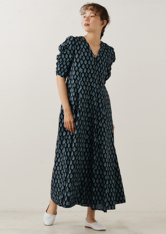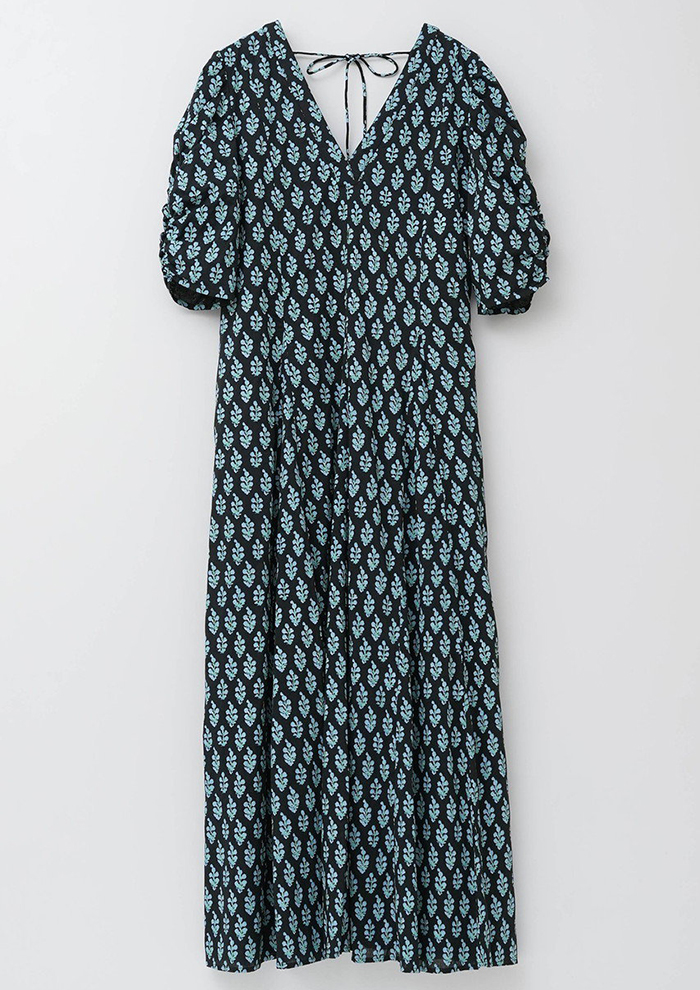 「落ち着いたトーンのプリントドレスはほんのり秋気分をまといたいときに。エアリーで肌なじみのよいコットンボイル素材と美しく広がる優雅なロングシルエットで、ストレスフリーな着心地が堪能できます。前後V開きのネックラインや背中の華奢なリボンコードがさりげない甘さをオン。(バイヤーNARUMI)」。