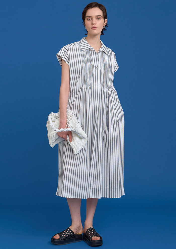 「前出の「ハウス オブ ロータス」のデザインブラウスと同素材で仕立てられたワンピースも要注目。3本ラインのストライプがブラックでもパキッとなりすぎず、少しやさしさの残る秋らしい装いを演出(バイヤーNAO)」。