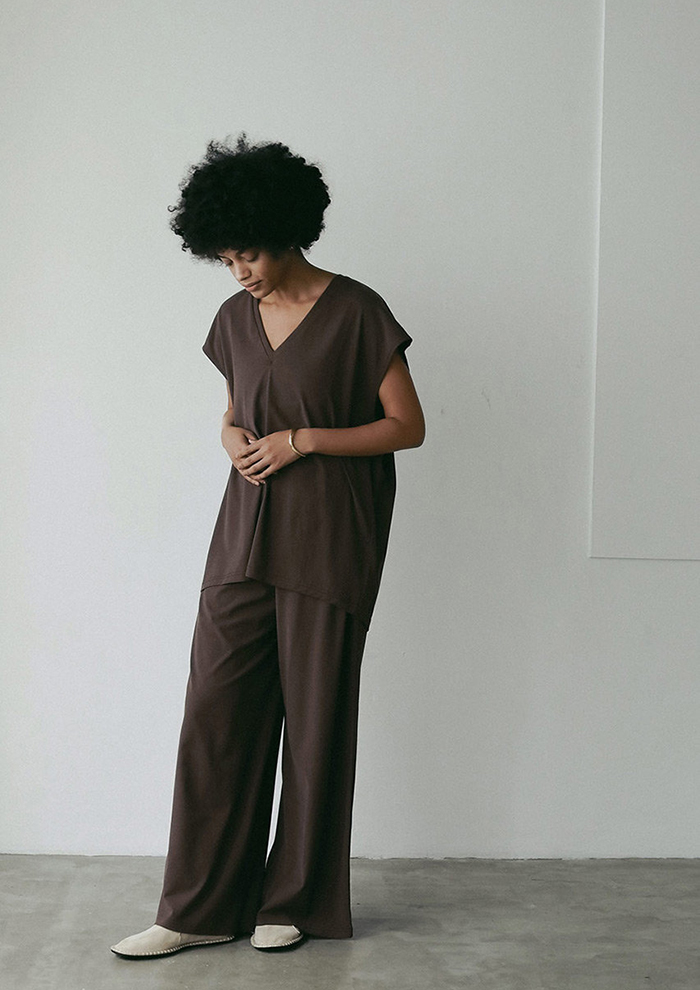 「残暑が厳しい今の時期でも、トレンドのブラウンカラーをワンツーコーデで取り入れると、秋気分が一気に高まります。「ハー」のセットアップは、ゆったりとしたシルエット、コットンのナチュラルさとリネンタッチのようなシャリ感が今の時期にぴったり。さらっとした肌触りで、接触冷感機能も備わっています(バイヤーSATOSHI)」。