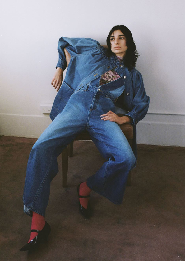 「スイッチシーズンに取り入れたくなるデニムルック。このジャケットは、10ozのデニムにギャザーをふんだんに入れたボリュームのあるシルエットが魅力です。フロントには、オリジナルのボタンを使用。オーバーオールは、2種類の異なるデニムを用いており、胸当てが取り外し可能なためワイドパンツとしても使えます。オールシーズン活躍するデニムアイテムは「ルール ロジェット」のひと際凝った逸品で(バイヤーYUKA)」。
