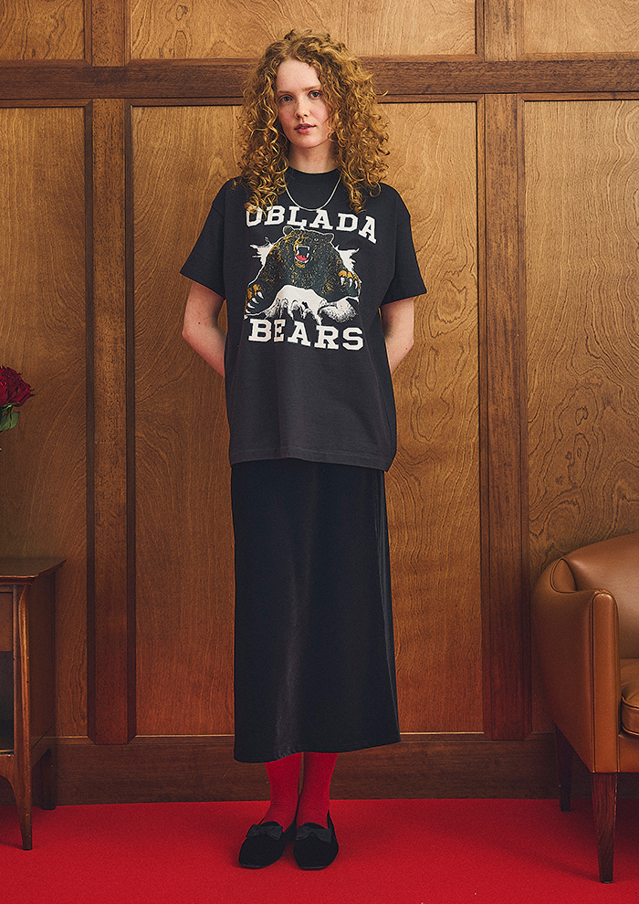 「晩夏は1枚でさらっと、秋冬にはニットカーデのインナーとしても活躍するTシャツ。「オブラダ」には、こなれ感たっぷりのアイテムが豊富です。こちらは、ワイルドなグラフィックで表現したユニークな“BEARS”Tシャツ。フロント&バックの大胆なプリントは、着込むほどに味が出てビンテージライクな風合いに。ベロアスカートと合わせて、ひと足早く秋冬気分を楽しんで(バイヤーMAKI)」。