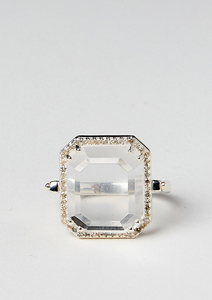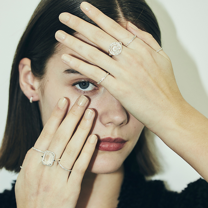 「天然ダイヤモンドと大きなホワイトクオーツの輝きが呼応して、一層美しく輝くスクエアリング。石に施したステップカットがモダンな印象を放ち、リングレイヤードでもさりげないインパクトを手元に与えます」。