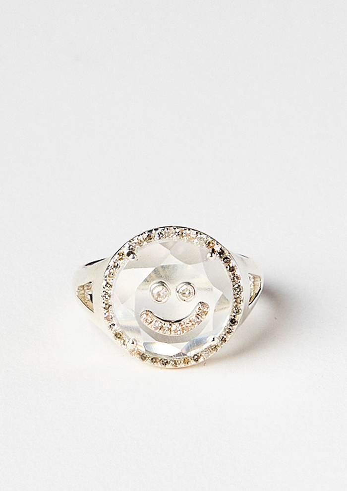 「ホワイトクオーツを天然ダイヤモンドで囲ったスマイルがチャーミングなリング。クラシックな手法でカットしたダイヤモンドはきらびやかすぎず、シックな輝きが大人の遊び心をくすぐります」。