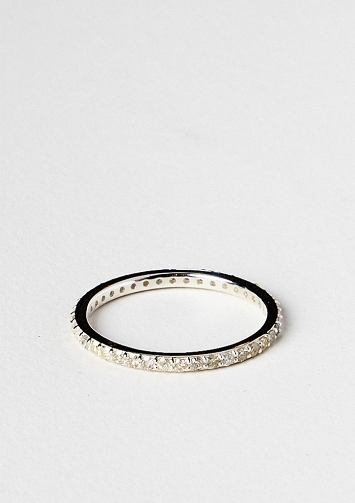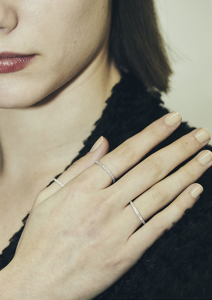 「シルバー925に爪留めした天然ダイヤモンドが光る、永遠の定番ジュエリー、エタニティリング。ゴールドのリングやマリッジリングなどとの重ねづけでも◎。手持ちのリングがいつもとは違う表情に」。