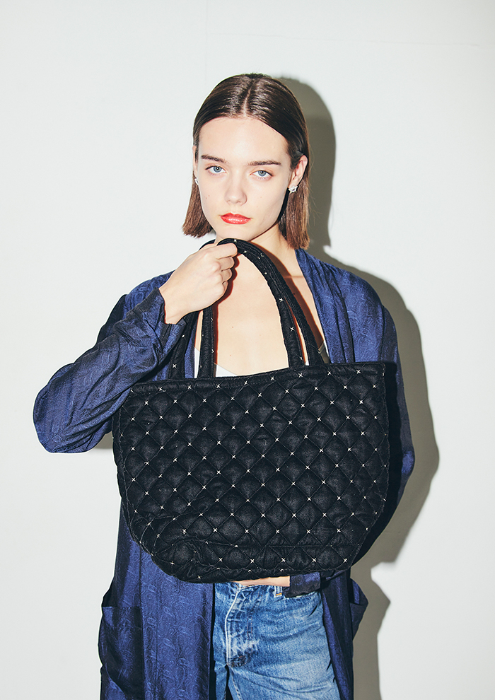 「インラインでは同素材で2サイズ展開のトートバッグもご用意。PCが収まるたっぷりサイズと、ちょっとしたお出かけやパーティシーンにもぴったりなミニサイズを展開しています。用途やシーンに合わせて選べるのがうれしいポイント」。