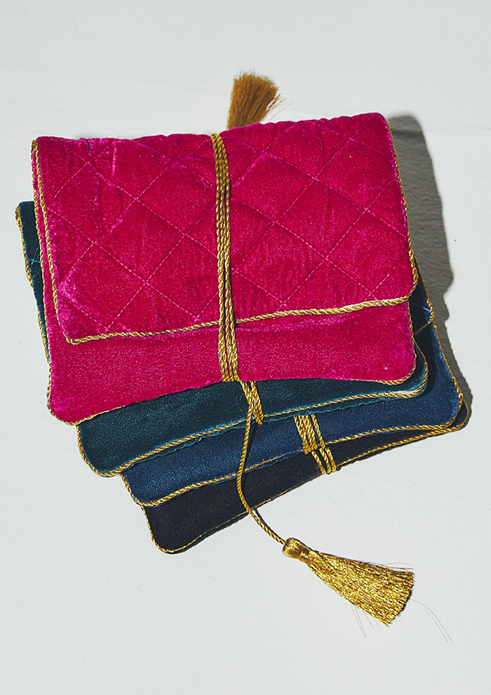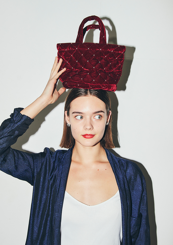 「クラシックなムード漂うベルベット素材にラメ刺しゅうがきらめく、エル・ショップ限定ショルダーバッグ。キルティング仕様なので、丈夫ながらもとても軽い使用感です。チェーンをスライドすることでショルダーバッグとして、斜め掛け巾着としてもお使いいただけます」。