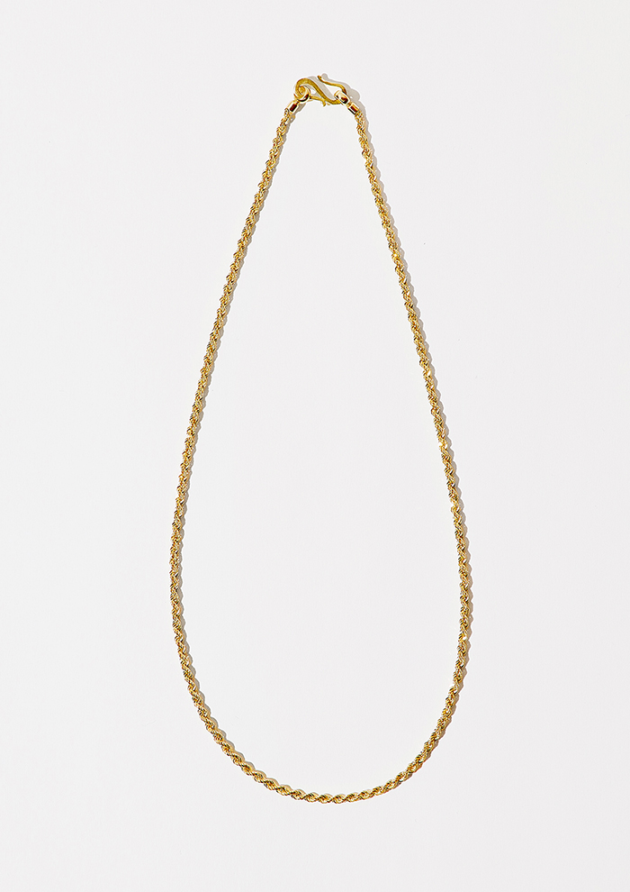 「K18のツイスト状に編み込まれたロープチェーンが美しいショートネックレス。時計のチェーンなどを編む特殊な機械を用い、精密技術を駆使した軽やかさがありながらも存在感のあるチェーンが特徴です。繊細なクラフト感のある留め具のS字フックが、個性を演出」。